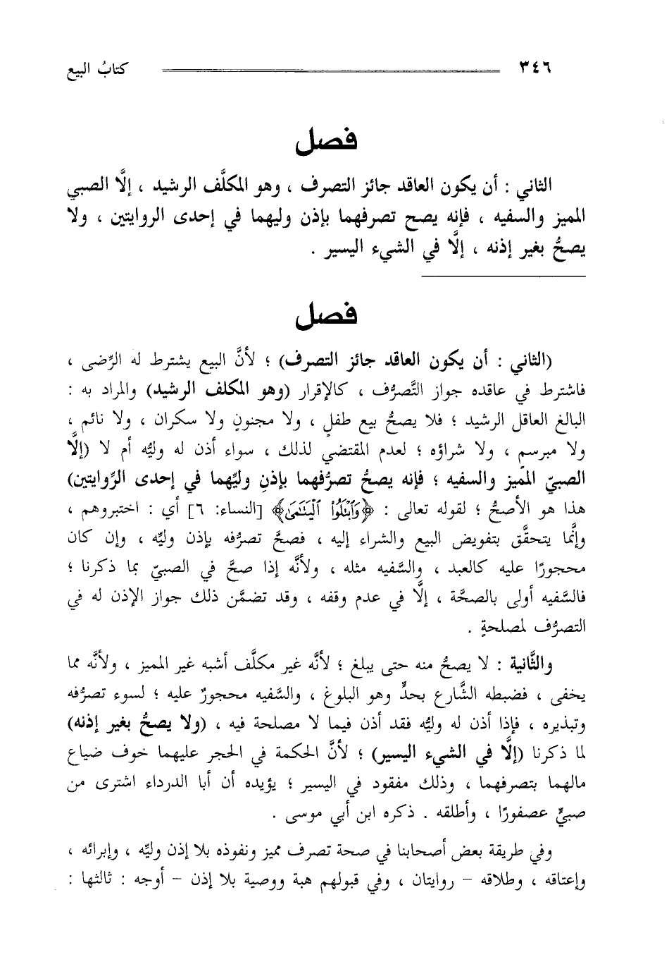 "الثاني: أن يكون العاقد جائز التصرف" لأن البيع يشترط له الرضى فاشترط في عاقده جواز التصرف كالإقرار "وهو المكلف الرشيد" والمراد به: البالغ العاقل الرشيد فلا يصح بيع طفل ولا مجنون ولا سكران ولا نائم ولا مبرسم ولا شراؤه لعدم المقتضي لذلك سواء أذن له وليه أم لا "إلا الصبي المميز والسفيه، فإنه يصح تصرفهما بإذن وليهما في إحدى الروايتين" هذا هو الأصح لقوله تعالى: {وَابْتَلُوا الْيَتَامَى} [النساء: 6] أي: اختبروهم وإنما يتحقق بتفويض البيع والشراء إليه فصح تصرفه بإذن وليه وإن كان محجورا عليه كالعبد والسفيه مثله ولأنه إذا صح في الصبي بما ذكرنا فالسفيه أولى بالصحة إلا في عدم وقفه وقد تضمن ذلك جواز الإذن له في التصرف لمصلحة.