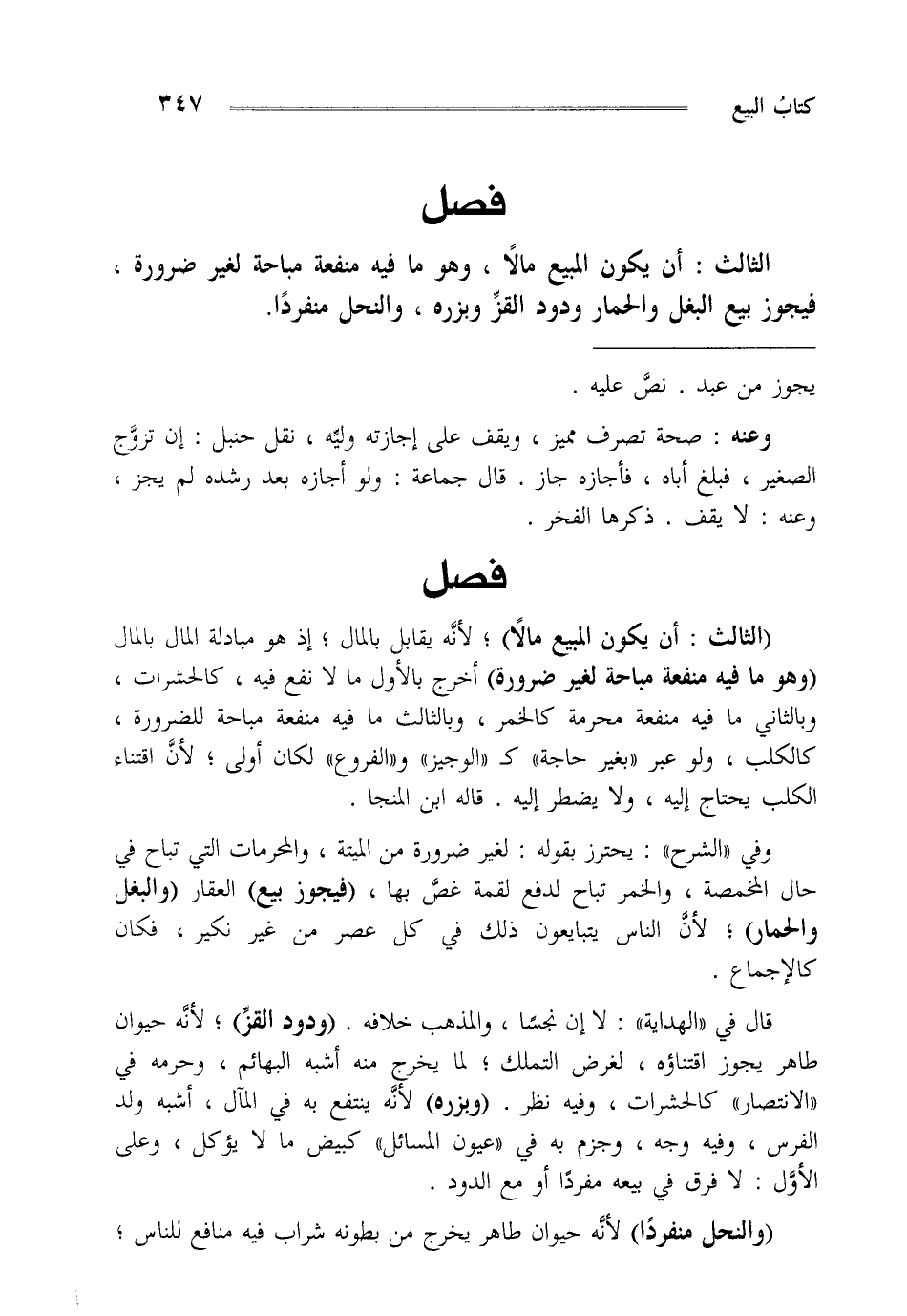 الثالث: أن يكون المبيع مالا وهو ما فيه منفعة مباحة لغير ضرورة فيجوز بيع البغل والحمار ودود القز وبزره والنحل منفردا.