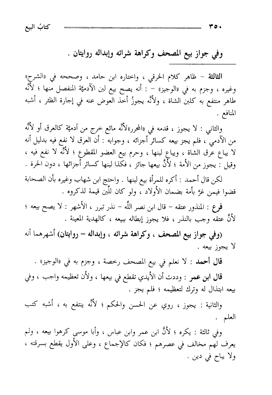 "وفي جواز بيع المصحف وكراهة شرائه وإبداله روايتان" أشهرهما أنه لا يجوز بيعه.
