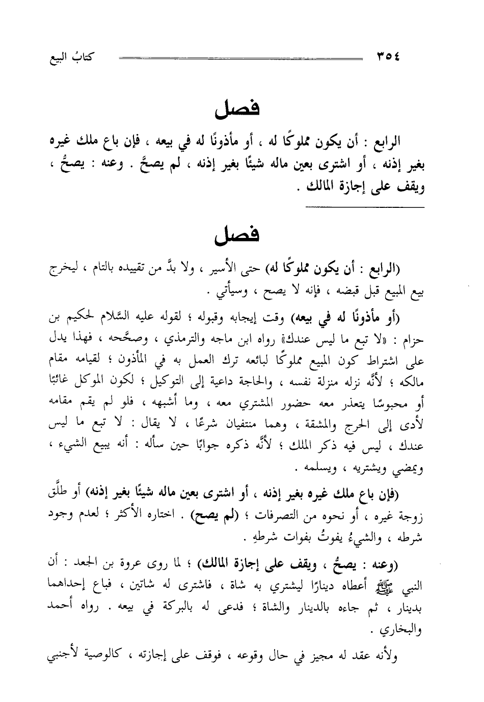 الرابع: أن يكون مملوكا له أو مأذونا له في بيعه فإن باع ملك غيره بغير إذنه أو اشترى بعين ماله شيئا بغير إذنه لم يصح وعنه يصح ويقف على إجازة المالك.