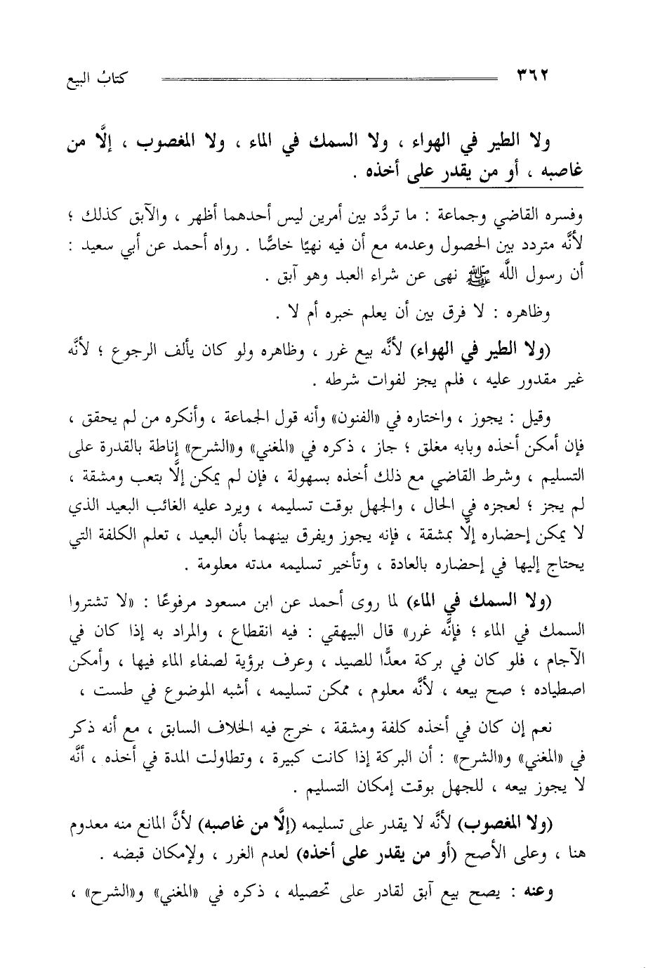 ولا الطير في الهواء ولا السمك في الماء ولا المغصوب إلا من غاصبه أو من يقدر على أخذه.