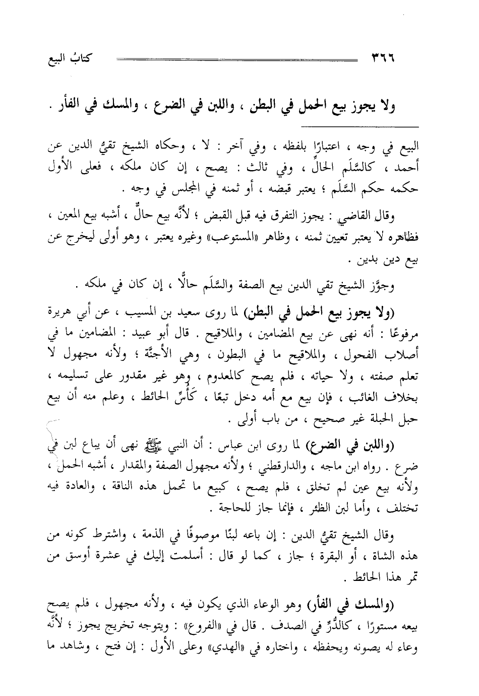ولا يجوز بيع الحمل في البطن واللبن في الضرع والمسك في الفأر.