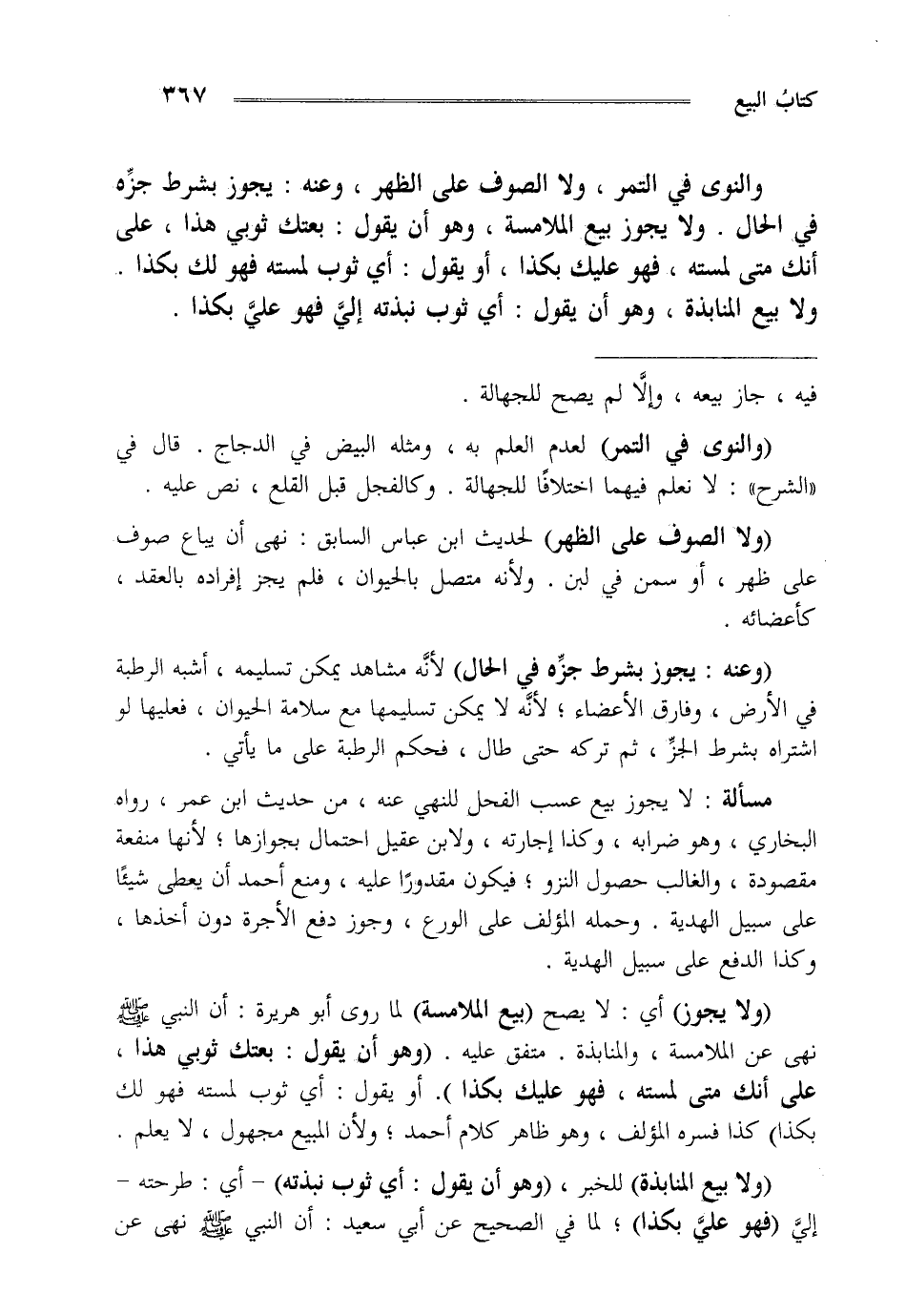 والنوى في التمر ولا الصوف على الظهر وعنه يجوز بشرط جزه في الحال ولا يجوز بيع الملامسة وهو أن يقول بعتك ثوبي هذا على أنك متى لمسته فهو عليك بكذا أو يقول أي ثوب لمسته فهو لك بكذا ولا بيع المنابذة وهو أن يقول أي ثوب نبذته إلي فهو علي بكذا.
