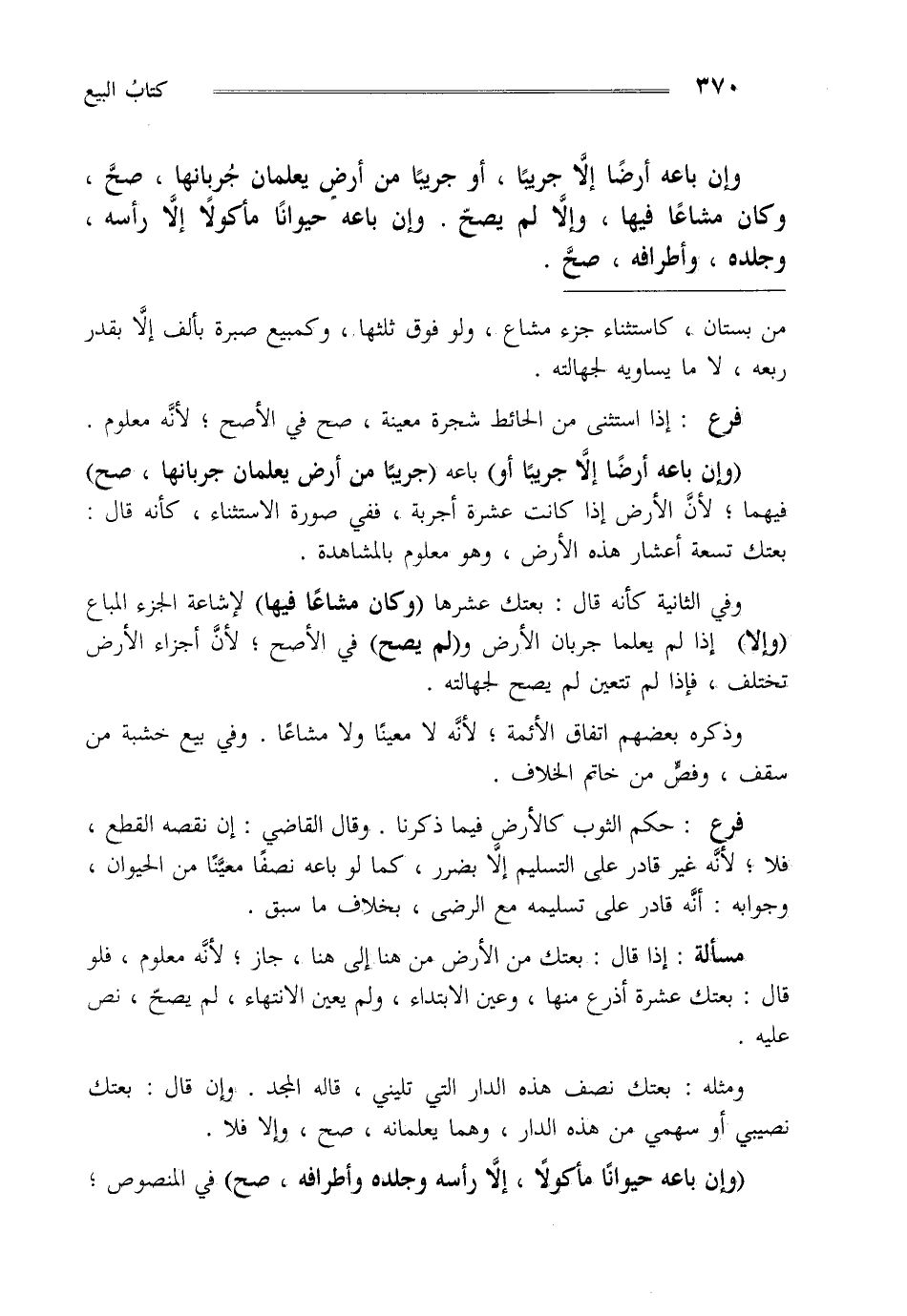 وإن باعه أرضا إلا جريبا أو جريبا من أرض يعلمان جربانها صح وكان مشاعا فيها وإلا لم يصح وإن باعه حيوانا مأكولا إلا رأسه وجلده و أطرافه صح.