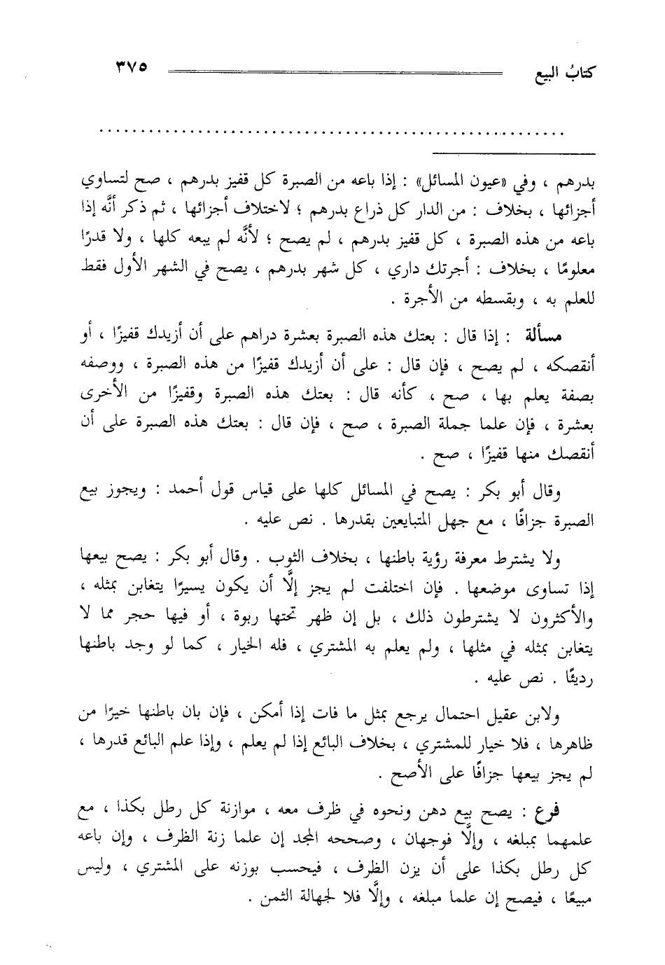 وقال أبو بكر: يصح في المسائل كلها على قياس قول أحمد ويجوز بيع الصبرة جزافا مع جهل المتبايعين بقدرها نص عليه.