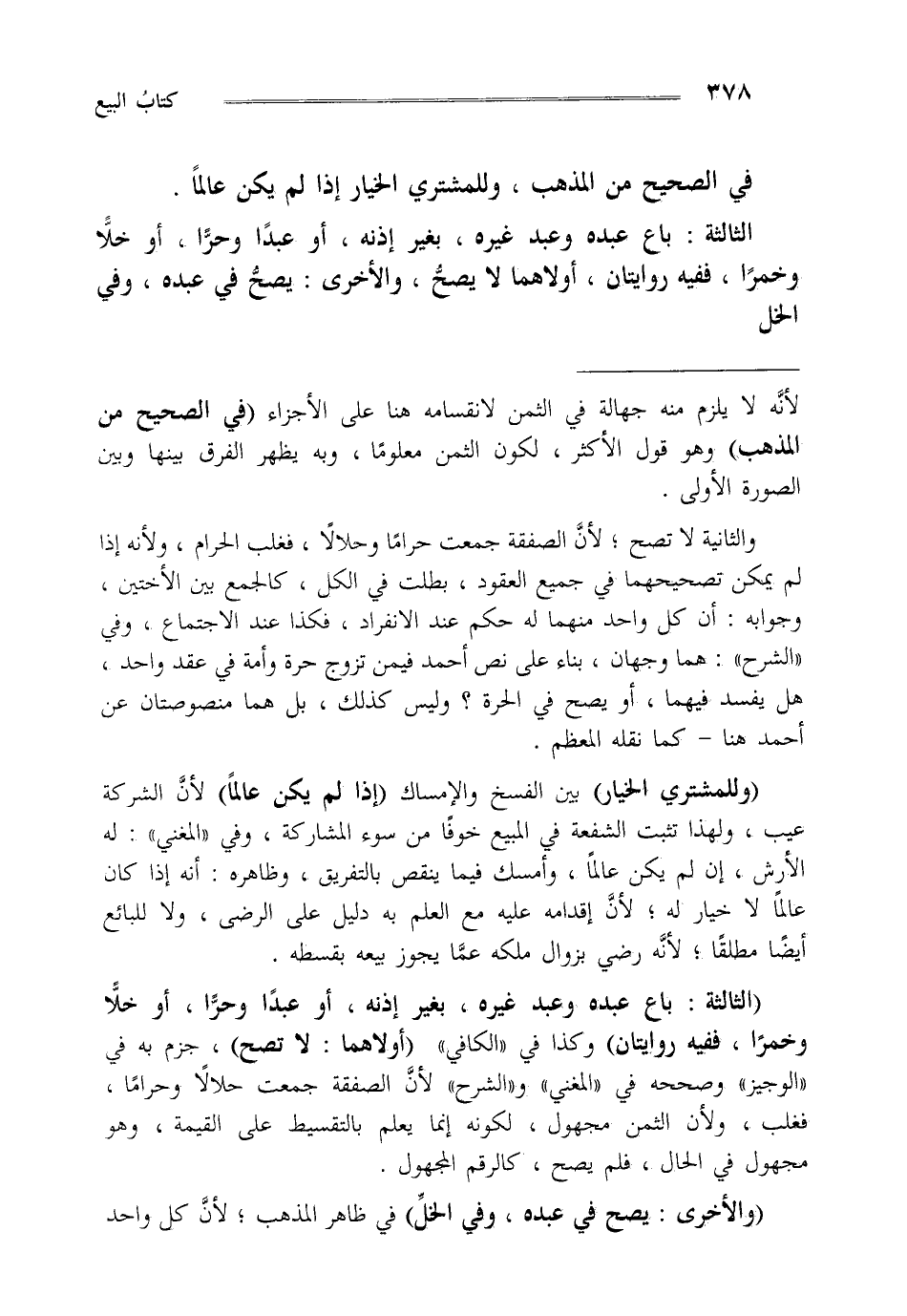"الثالثة: باع عبده وعبد غيره بغير إذنه أو عبدا وحرا أو خلا وخمرا ففيه روايتان" وكذا في "الكافي" "أولاهما: لا تصح"، جزم به في "الوجيز" وصححه في "المغني" و"الشرح" لأن الصفقة جمعت حلالا وحراما فغلب ولأن الثمن مجهول لكونه إنما يعلم بالتقسيط على القيمة وهو مجهول في الحال فلم يصح كالرقم المجهول.