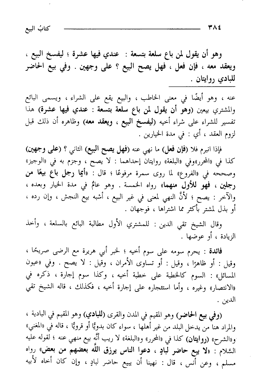 فإذا انبرم فلا "فإن فعل" ما نهي عنه "فهل يصح البيع" الثاني؟ "على وجهين" كذا في "المحرر" وفي "البلغة" روايتان إحداهما لا يصح وجزم به في "الوجيز" وصححه في "الفروع" لما روى سمرة مرفوعا قال: "أيما رجل باع بيعا من رجلين فهو للأول منهما" رواه الخمسة. وهو عام في مدة الخيار وبعده والآخر يصح لأن النهي لمعنى في غير البيع أشبه بيع النجش وإن رده أو بذل لمشتر بأكثر مما اشتراها فوجهان.