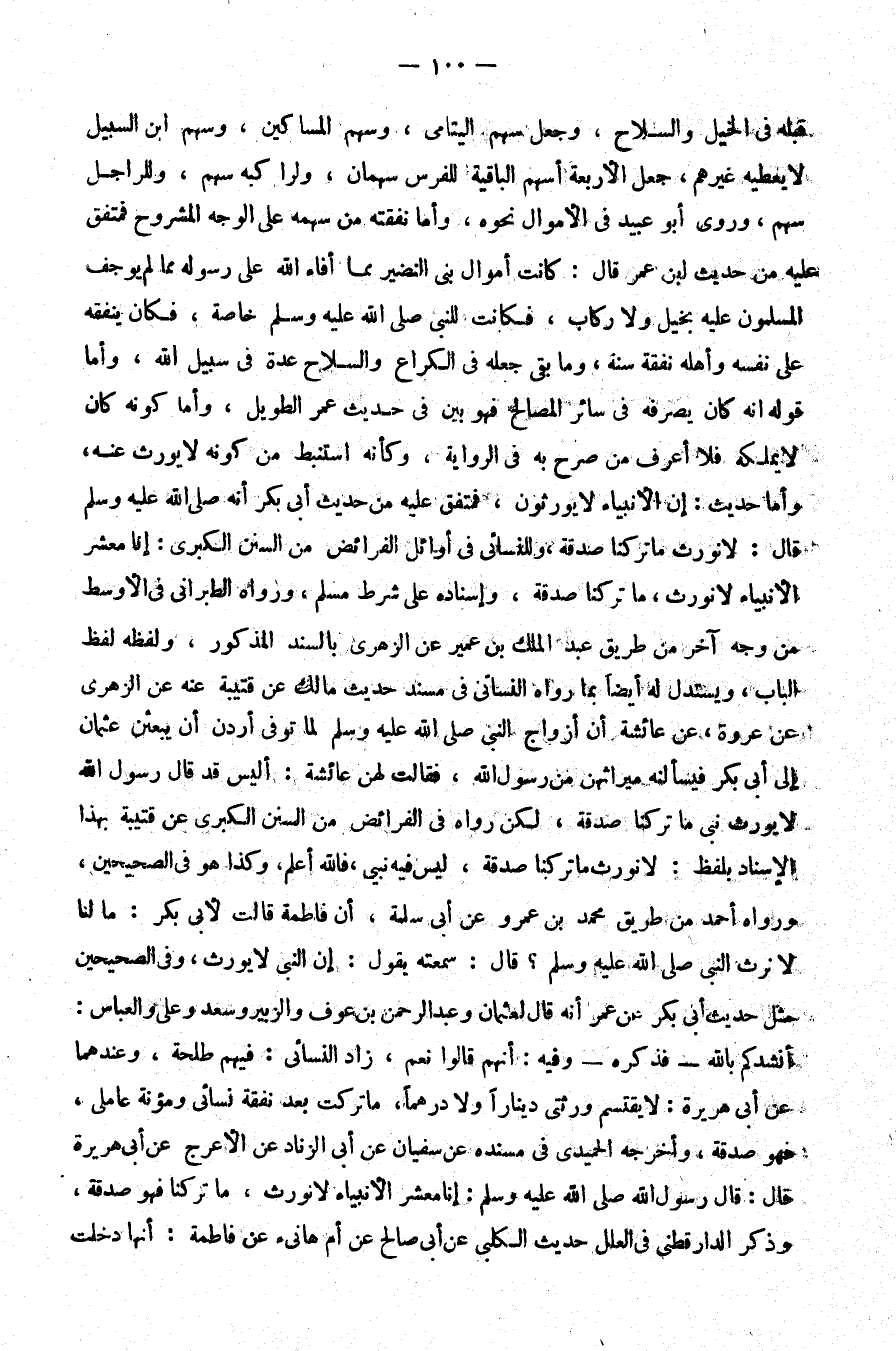 قبله في الخيل والسلاح وجعل سهم اليتامى وسهم المساكين وسهم بن السبيل لا يعطيه غيرهم جعل الأربعة أسهم الباقية للفرس سهمان ولراكبه سهم وللراجل سهم وروى أبو عبيد في الأموال نحوه وأما نفقته من سهمه على الوجه المشروح فمتفق عليه من حديث بن عمر قال كانت أموال بني النضير مما أفاء الله على رسوله مما لم يوجف المسملون عليه بخيل ولا ركاب فكانت للنبي صلى الله عليه و سلم خاصة فكان ينفقه على نفسه وأهله نفقة سنة وما بقي جعله في الكراع والسلاح عدة في سبيل الله وأما قوله انه كان يصرفه في سائر المصالح فهو بين في حديث عمر الطويل وأما كونه كان لا يملكه فلا أعرف من صرح به في الرواية وكأنه استنبط من كونه لا يورث عنه وأما حديث إن الأنبياء لا يورثون فمتفق عليه من حديث أبي بكر أنه صلى الله عليه و سلم قال لا نورث ما تركنا صدقة وللنسائي في أوائل الفرائض من السنن الكبرى إنا معشر الأنبياء لا نورث ما تركنا صدقة وإسناده على شرط مسلم ورواه الطبراني في الأوسط من وجه آخر من طريق عبد الملك بن عمير عن الزهري بالسند المذكور ولفظه لفظ الباب ويستدل له أيضا بما رواه النسائي في مسند حديث مالك عن قتيبة عنه عن الزهري عن عروة عن عائشة أن أزواج النبي صلى الله عليه و سلم لما توفي أردن أن يبعثن عثمان إلى أبي بكر فيسألنه ميراثهن من رسول الله فقالت لهن عائشة أليس قد قال رسول الله لا يورث نبي ما تركنا صدقة لكن رواه في الفرائض من السنن الكبرى عن قتيبة بهذا الإسناد بلفظ لا نورث ما تركنا صدقة ليس فيه نبي فالله أعلم وكذا هو في الصحيحين ورواه أحمد من طريق محمد بن عمرو عن أبي سلمة أن فاطمة قالت لأبي بكر ما لنا لا نرث النبي صلى الله عليه و سلم قال سمعته يقول إن النبي لا يورث وفي الصحيحين مثل حديث أبي بكر عن عمر أنه قال لعثمان وعبد الرحمن بن عوف والزبير وسعد وعلي والعباس أنشدكم بالله فذكره وفيه أنهم قالوا نعم زاد النسائي فيهم طلحة وعندهما عن أبي هريرة لا يقتسم ورثتي دينارا ولا درهما ما تركت بعد نفقة نسائي ومؤنة عاملي فهو صدقة وأخرجه الحميدي في مسنده عن سفيان عن أبي الزناد عن الأعرج عن أبي هريرة قال قال رسول الله صلى الله عليه و سلم إنا معشر الأنبياء لا نورث ما تركنا فهو صدقة وذكر الدارقطني في العلل حديث الكلبي عن أبي صالح عن أم هانئ عن فاطمة أنها دخلت