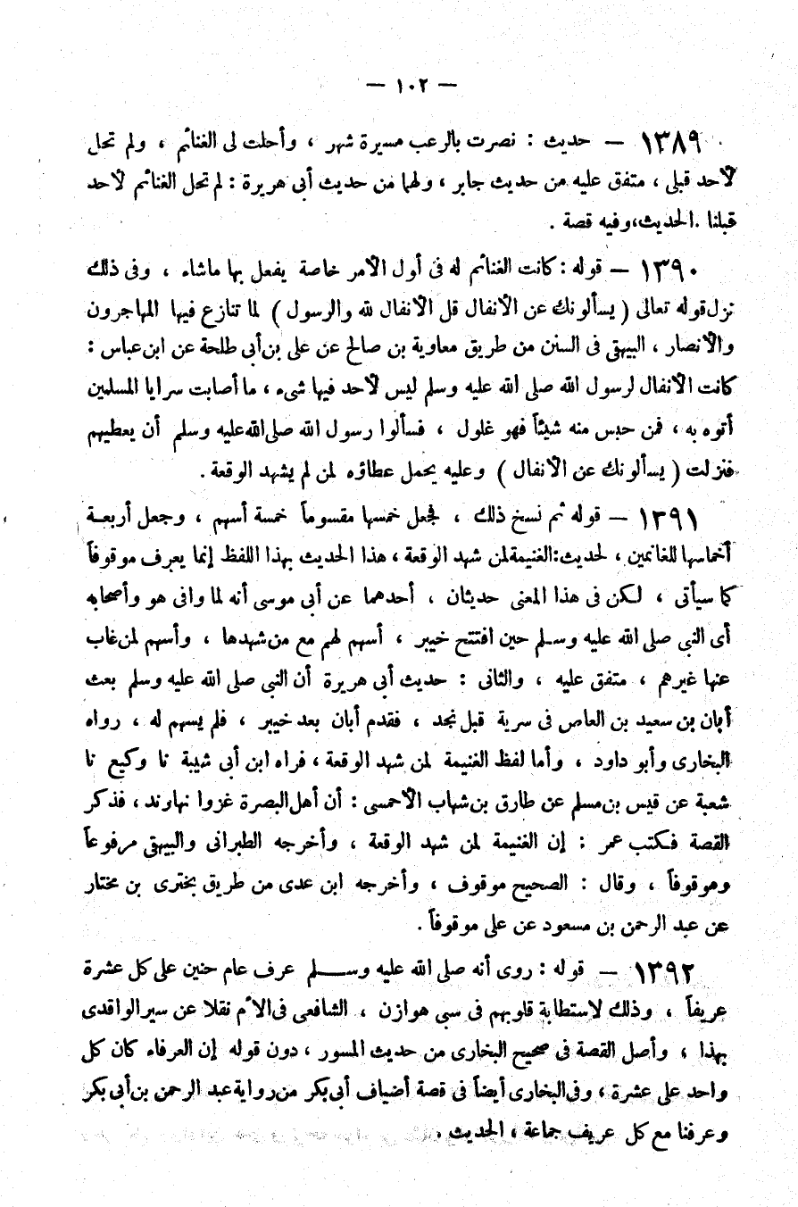 1391 - قوله ثم نسخ ذلك فجعل خمسها مقسوما خمسة أسهم وجعل أربعة أخماسها للغانمين لحديث الغنيمة لمن شهد الوقعة هذا الحديث بهذا اللفظ إنما يعرف موقوفا كما سيأتي لكن في هذا المعنى حديثان أحدهما عن أبي موسى أنه لما وافى هو وأصحابه أي النبي صلى الله عليه و سلم حين افتتح خيبر أسهم لهم مع من شهدها وأسهم لمن غاب عنها غيرهم متفق عليه والثاني حديث أبي هريرة أن النبي صلى الله عليه و سلم بعث أبان بن سعيد بن العاص في سرية قبل نجد فقدم أبان بعد خيبر فلم يسهم له رواه البخاري وأبو داود وأما لفظ الغنيمة لمن شهد الوقعة فرواه بن أبي شيبة نا وكيع نا شعبة عن قيس بن مسلم عن طارق بن شهاب الأحمسي أن أهل البصرة غزوا نهاوند فذكر القصة فكتب عمر إن الغنيمة لمن شهد الوقعة وأخرجه الطبراني والبيهقي مرفوعا وموقوفا وقال الصحيح موقوف وأخرجه بن عدي من طريق بختري بن مختار عن عبد الرحمن بن مسعود عن علي موقوفا