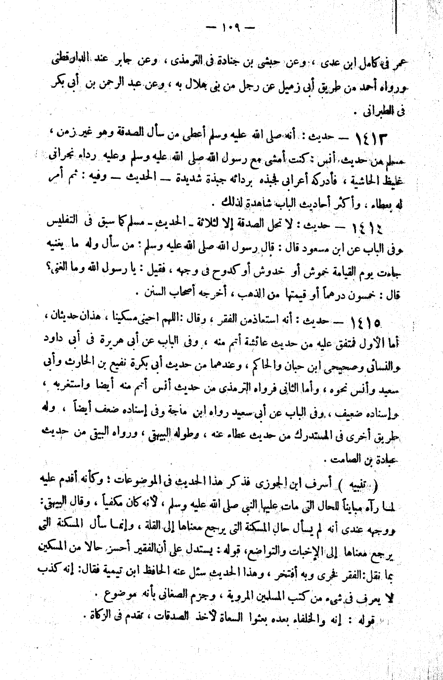 1414 - حديث لا تحل الصدقة إلا لثلاثة الحديث مسلم كما سبق في التفليس وفي الباب عن بن مسعود قال قال رسول الله صلى الله عليه و سلم من سأل وله ما يغنيه جاءت يوم القيامة خموش أو خدوش أو كدوح في وجهه فقيل يا رسول الله وما الغنى قال خمسون درهما أو قيمتها من الذهب أخرجه أصحاب السنن