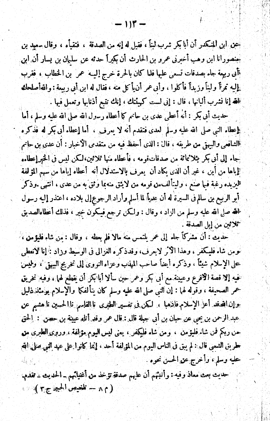 حديث أبي بكر أنه أعطى عدي بن حاتم كما أعطاه رسول الله صلى الله عليه و سلم أما إعطاء النبي صلى الله عليه و سلم لعدي فتقدم أنه لا يعرف أما إعطاء أبي بكر له فذكره الشافعي والبيهقي من طريقه قال الذي أحفظ فيه من متقدمي الأخبار أن عدي بن حاتم جاء إلى أبي بكر بثلاثمائة من صدقات قومه فأعطاه منها ثلاثين لكن ليس في الخبر إعطاءه إياها من أين غير أن الذي يكاد أن يعرف بالاستدلال أنه أعطاه إياها من سهم المؤلفة ليزيده رغبة فيما صنع وليتألف من قومه من لا يثق منه بما وثق به من عدي انتهى وذكر أبو الربيع بن سالم في السيرة له أن عديا لما أسلم وأراد الرجوع إلى بلاده اعتذر إليه رسول الله صلى الله عليه و سلم من الزاد وقال ولكن ترجع فيكون خير فذلك أعطاه الصديق ثلاثين من إبل الصدقة
