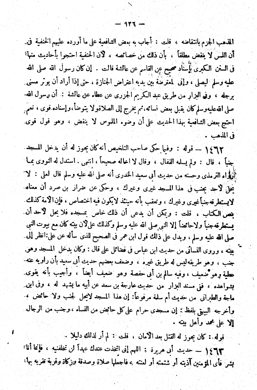 المذهب الجزم بانتقاضه قلت أجاب به بعض الشافعية على ما أورده عليهم الحنفية في أن اللمس لا ينقض مطلقا بأن ذلك من خصائصه لأن الحنفية احتجوا بأحاديث منها في السنن الكبرى بإسناد صحيح عن القاسم عن عائشة قالت إن كان رسول الله صلى الله عليه و سلم ليصلي وإني لمعترضة بين يديه اعتراض الجنازة حتى إذا أراد أن يوتر مسني برجله وفي البزار من طريق عبد الكريم الجزري عن عطاء عن عائشة أن رسول الله صلى الله عليه و سلم كان يقبل بعض نسائه ثم يخرج إلى الصلاة ولا يتوضأ وإسناده قوي نعم احتج بعض الشافعية بهذا الحديث على أن وضوء الملموس لا ينقض وهو قول قوي في المذهب