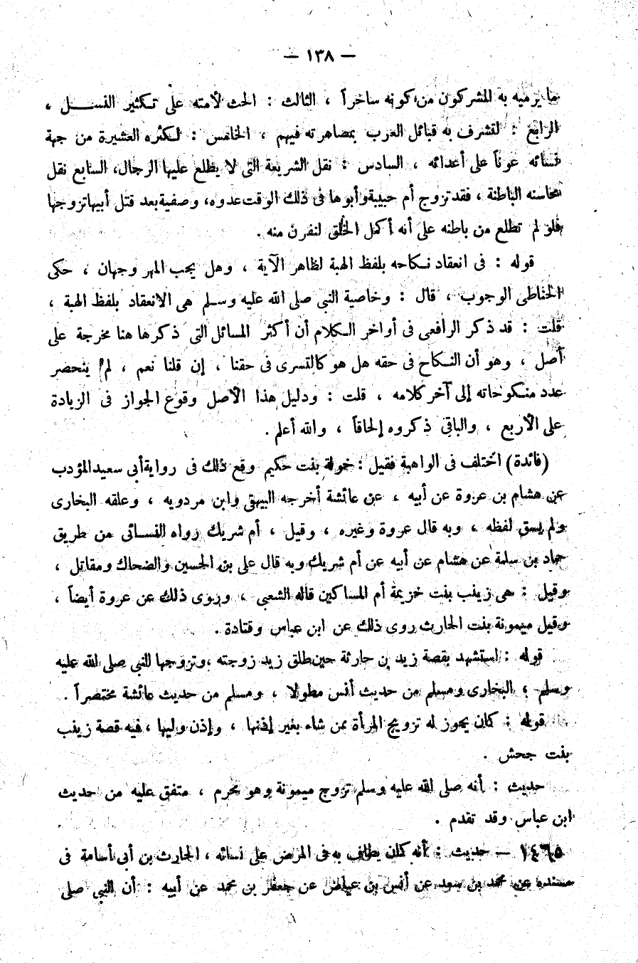 ما يرميه به المشركون من كونه ساحرا الثالث الحث لأمته على تكثير النسل الرابع لتشرف به قبائل العرب بمصاهرته فيهم الخامس لكثرة العشيرة من جهة نسائه عونا على أعدائه السادس نقل الشريعة التي لا يطلع عليها الرجال السابع نقل محاسنه الباطنة فقد تزوج أم حبيبة وأبوها في ذلك الوقت عدوه وصفية بعد قتل أبيها تزوجها فلو لم تطلع من باطنه على أنه أكمل الخلق لنفرن منه