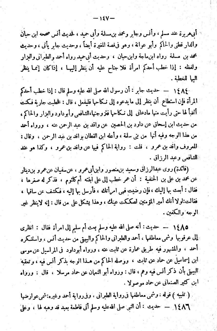 1484 - حديث جابر أن رسول الله صلى الله عليه و سلم قال إذا خطب أحدكم المرأة فإن استطاع أن ينظر إلى ما يدعوه إلى نكاحها فليفعل قال فخطبت جارية فكنت أتخبأ لها حتى رأيت منها ما دعاني إلى نكاحها فتزوجتها الشافعي وأبو داود والبزار والحاكم من حديث بن إسحاق عن داود بن الحصين عن واقد بن عبد الرحمن عنه ورواه أحمد من هذا الوجه وفيه أنها من بني سلمة وأعله بن القطان بواقد بن عبد الرحمن وقال المعروف واقد بن عمرو قلت رواية الحاكم فيها عن واقد بن عمرو وكذا هو عند الشافعي وعبد الرزاق فائدة روى عبد الرزاق وسعيد بن منصور وابن أبي عمرو عن سفيان عن عمرو بن دينار عن محمد بن علي بن الحنفية أن عمر خطب إلى علي ابنته أم كلثوم فذكر له صغرها فقال أبعث بها إليك فإن رضيت فهي امرأتك فأرسل بها إليه فكشف عن ساقها فقالت لولا أنك أمير المؤمنين لصككت عينك وهذا يشكل على من قال إنه لا ينظر غير الوجه والكفين