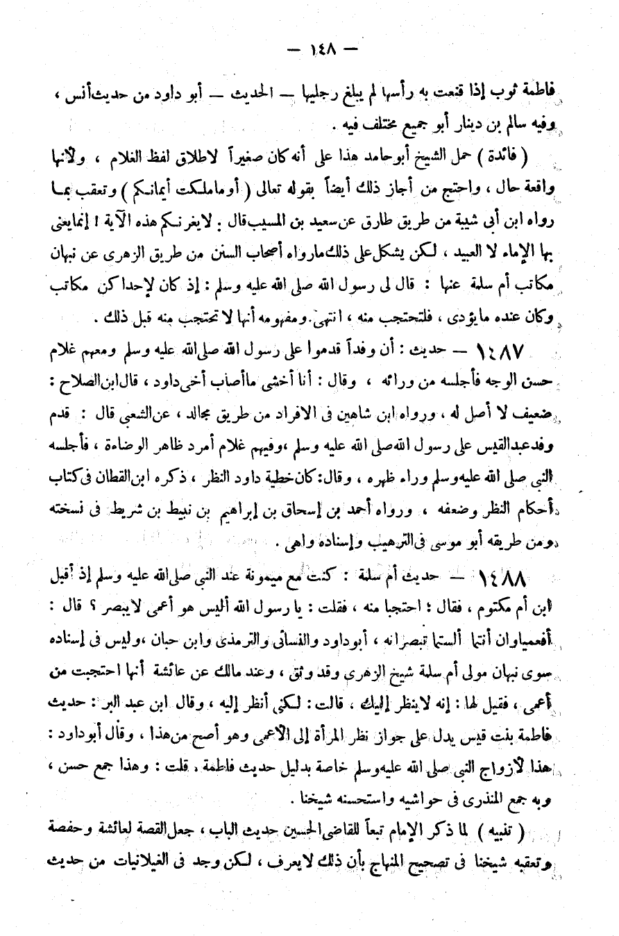 1488 - حديث أم سلمة كنت مع ميمونة عند النبي صلى الله عليه و سلم إذ أقبل بن أم مكتوم فقال احتجبا منه فقلت يا رسول الله أليس هو أعمى لا يبصر قال أفعمياوان أنتما ألستما تبصرانه أبو داود والنسائي والترمذي وابن حبان وليس في إسناده سوى نبهان مولى أم سلمة شيخ الزهري وقد وثق وعند مالك عن عائشة أنها احتجبت من أعمى فقيل لها إنه لا ينظر إليك قالت لكني أنظر إليه وقال بن عبد البر حديث فاطمة بنت قيس يدل على جواز نظر المرأة إلى الأعمى وهو أصح من هذا وقال أبو داود هذا لأزواج النبي صلى الله عليه و سلم خاصة بدليل حديث فاطمة قلت وهذا جمع حسن وبه جمع المنذري في حواشيه واستحسنه شيخنا تنبيه لما ذكر الإمام تبعا للقاضي الحسين حديث الباب جعل القصة لعائشة وحفصة وتعقبه شيخنا في تصحيح المنهاج بأن ذلك لا يعرف لكن وجد في الغيلانيات من حديث