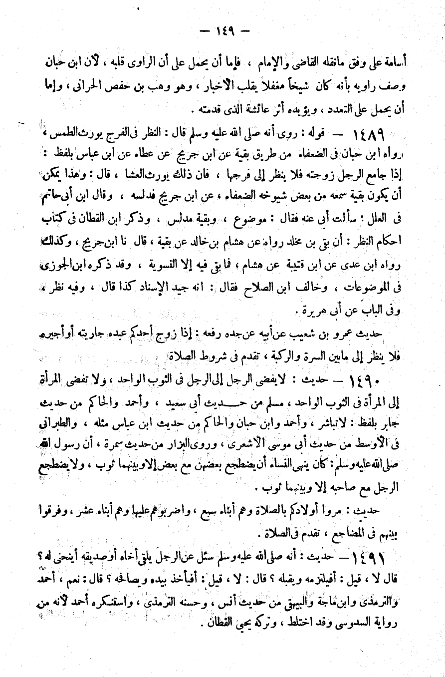 1490 - حديث لا يفضي الرجل إلى الرجل في الثوب الواحد ولا تفضي المرأة إلى المرأة في الثوب الواحد مسلم من حديث أبي سعيد وأحمد والحاكم من حديث جابر بلفظ لا تباشر وأحمد وابن حبان والحاكم من حديث بن عباس مثله والطبراني في الأوسط من حديث أبي موسى الأشعري وروى البزار من حديث سمرة أن رسول الله صلى الله عليه و سلم كان ينهى النساء أن يضطجع بعضهن مع بعض إلا وبينهما ثوب ولا يضطجع الرجل مع صاحبه إلا وبينهما ثوب