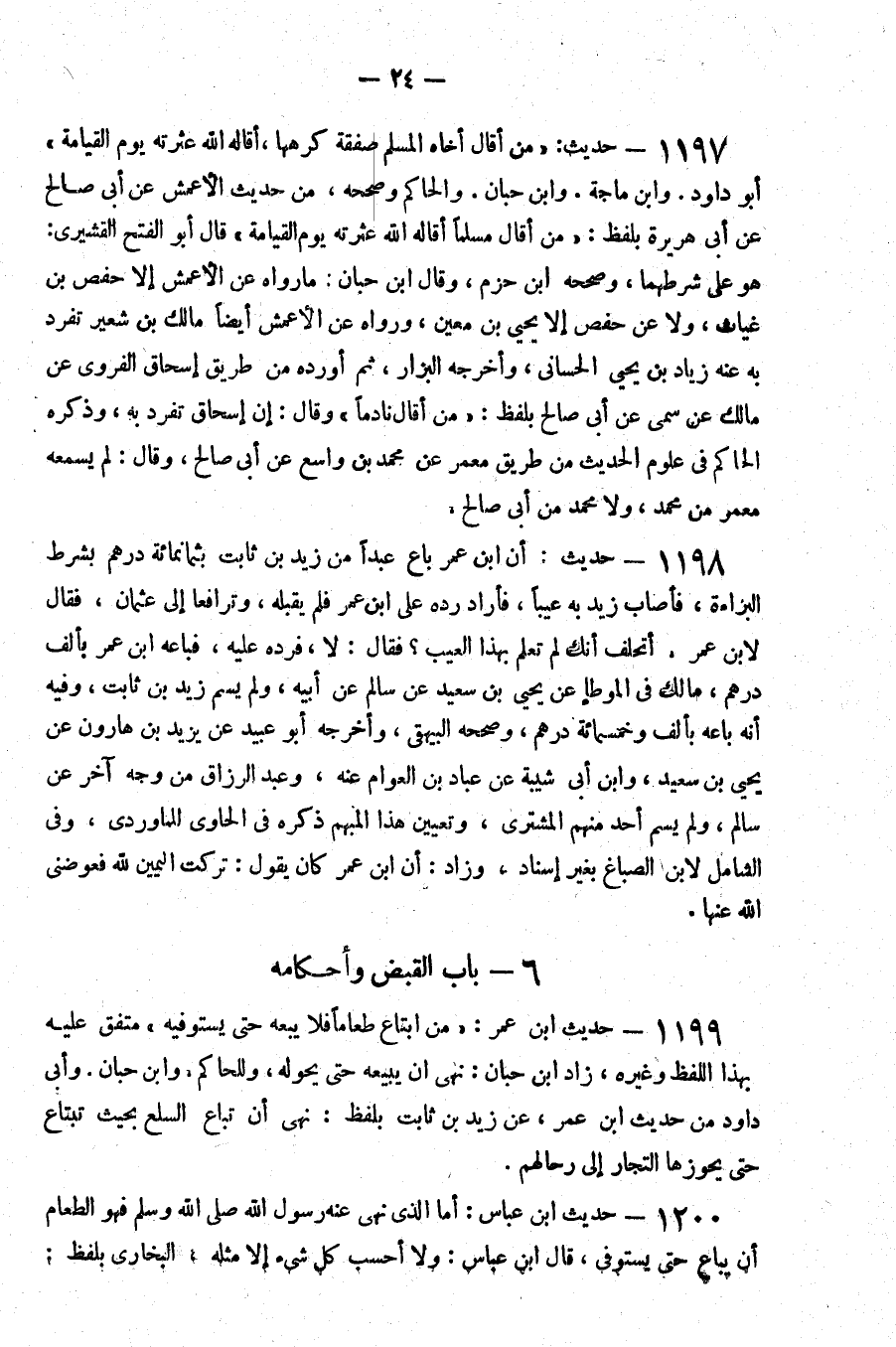 1199 - حديث بن عمر من ابتاع طعاما فلا يبعه حتى يستوفيه متفق عليه بهذا اللفظ وغيره زاد بن حبان نهى ان يبيعه حتى يحوله وللحاكم وابن حبان وأبي داود من حديث بن عمر عن زيد بن ثابت بلفظ نهى أن تباع السلع بحيث تبتاع حتى يحوزها التجار إلى رحالهم