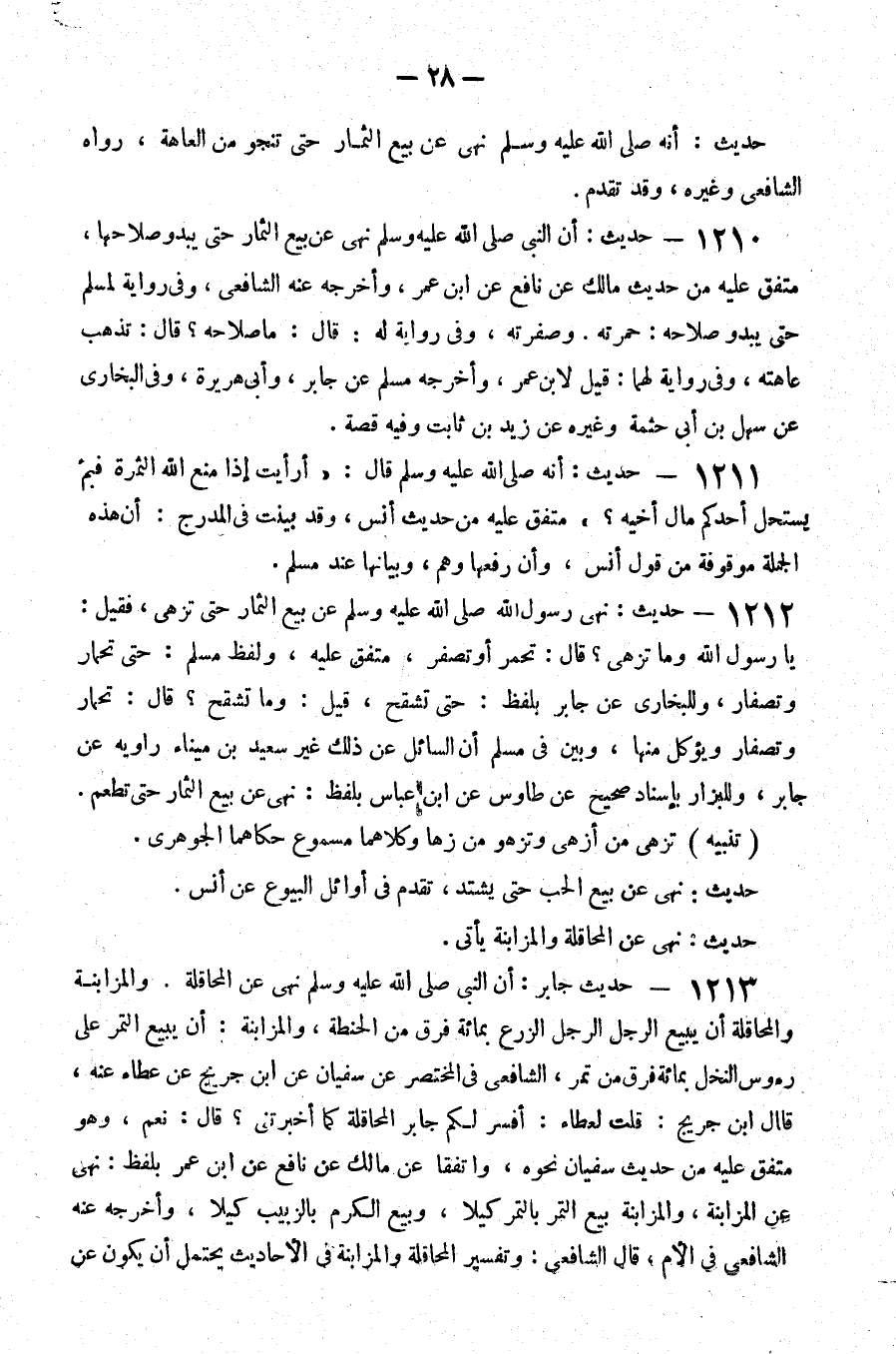 1210 - حديث أن النبي صلى الله عليه و سلم نهى عن بيع الثمار حتى يبدو صلاحها متفق عليه من حديث مالك عن نافع عن بن عمر وأخرجه عنه الشافعي وفي رواية لمسلم حتى يبدو صلاحه حمرته وصفرته وفي رواية له قال ما صلاحه قال تذهب عاهته وفي رواية لهما قيل لابن عمر وأخرجه مسلم عن جابر وأبي هريرة وفي البخاري عن سهل بن أبي حثمة وغيره عن زيد بن ثابت وفيه قصة