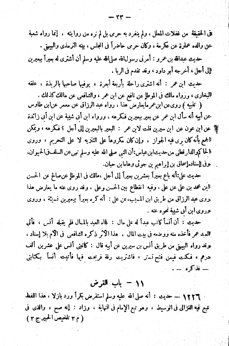 حديث بن عمر أنه اشترى راحلة بأربعة أبعرة يوفيها صاحبها بالربذة علقه البخاري ورواه مالك في الموطأ عن نافع عن بن عمر والشافعي عن مالك كذلك تنبيه روي عن بن عمر ما يعارض هذا رواه عبد الرزاق عن معمر عن بن طاوس عن أبيه أنه سأل بن عمر عن بعير ببعيرين فكرهه ورواه بن أبي شيبة عن بن أبي زائدة عن بن عون عن بن سيرين قلت لابن عمر البعير بالبعيرين إلى أجل فكرهه ويمكن الجمع بأنه كان يرى فيه الجواز وإن كان مكروها على التنزيه لا على التحريم وروى الحاكم والدارقطني من حديث بن عباس أن النبي صلى الله عليه و سلم عن السلف في الحيوان وفي إسناده إسحاق بن إبراهيم بن جوثى وهاه بن حبان