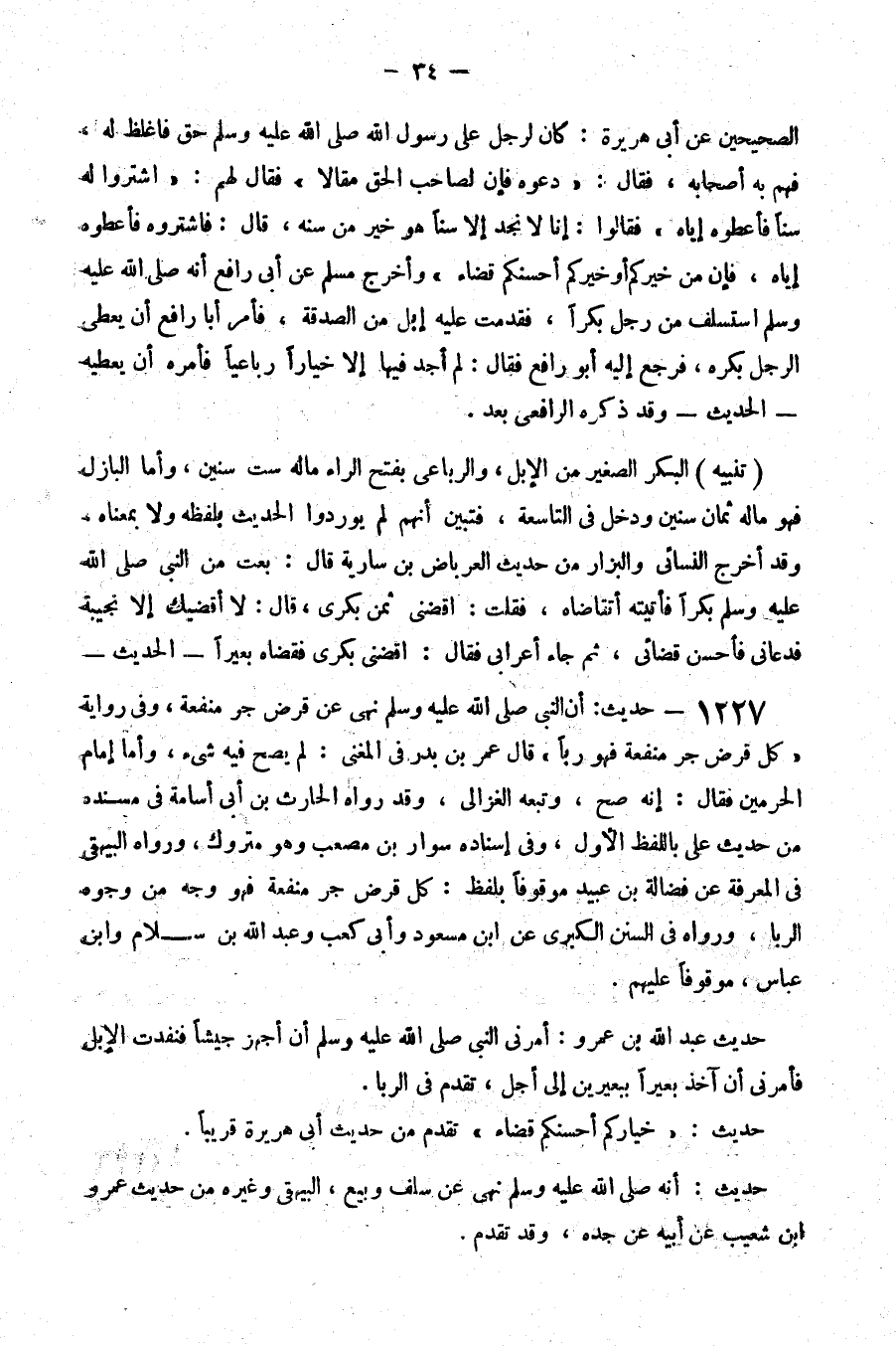 الصحيحين عن أبي هريرة كان لرجل على رسول الله صلى الله عليه و سلم حق فاغلظ له فهم به أصحاب فقال دعوه فإن لصاحب الحق مقالا فقال لهم اشتروا له سنا فأعطوه إياه فقالوا إنا لا نجد إلا سنا هو خير من سنه قال فاشتروه فأعطوه إياه فإن من خيركم أو خيركم أحسنكم قضاء وأخرج مسلم عن أبي رافع أنه صلى الله عليه و سلم استسلف من رجل بكرا فقدمت عليه إبل من الصدقة فأمر أبا رافع أن يعطي الرجل بكره فرجع إليه أبو رافع فقال لم أجد فيها إلا خيارا رباعيا فأمره أن يعطيه الحديث وقد ذكره الرافعي بعد تنبيه البكر الصغير من الإبل والرباعي بفتح الراء ما له ست سنين وأما البازل فهو ما له ثمان سنين ودخل في التاسعة فتبين أنهم لم يوردوا الحديث بلفظه ولا بمعناه وقد أخرج النسائي والبزار من حديث العرباض بن سارية قال بعت من النبي صلى الله عليه و سلم بكرا فأتيته أتقاضاه فقلت اقضني ثمن بكري قال لا أقضيك إلا نجيبة فدعاني فأحسن قضائي ثم جاء أعرابي فقال اقضني بكري فقضاه بعيرا الحديث
