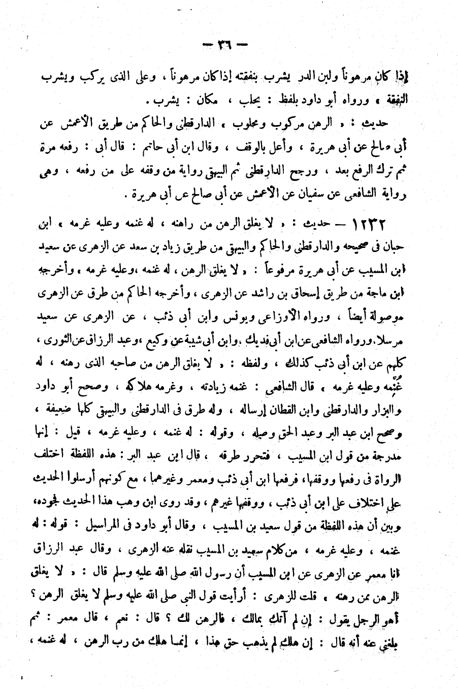 1232 - حديث لا يغلق الرهن من راهنه له غنمه وعليه غرمه بن حبان في صحيحه والدارقطني والحاكم والبيهقي من طريق زياد بن سعد عن الزهري عن سعيد بن المسيب عن أبي هريرة مرفوعا لا يغلق الرهن له غنمه وعليه غرمه وأخرجه بن ماجة من طريق إسحاق بن راشد عن الزهري وأخرجه الحاكم من طرق عن الزهري موصولة أيضا ورواه الأوزاعي ويونس وابن أبي ذئب عن الزهري عن سعيد مرسلا ورواه الشافعي عن بن أبي فديك وابن أبي شيبة عن وكيع وعبد الرزاق عن الثوري كلهم عن بن أبي ذئب كذلك ولفظه لا يغلق الرهن من صاحبه الذي رهنه له غنمه وعليه غرمه قال الشافعي غنمه زيادته وغرمه هلاكه وصحح أبو داود والبزار والدارقطني وابن القطان إرساله وله طرق في الدارقطني والبيهقي كلها ضعيفة وصحح بن عبد البر وعبد الحق وصله وقوله له غنمه وعليه غرمه قيل إنها مدرجة من قول بن المسيب فتحرر طرقه قال بن عبد البر هذه اللفظة اختلف الرواة في رفعها ووقفها فرفعها بن أبي ذئب ومعمر وغيرهما مع كونهم أرسلوا الحديث على اختلاف على بن أبي ذئب ووقفها غيرهم وقد روى بن وهب هذا الحديث فجوده وبين أن هذه اللفظة من قول سعيد بن المسيب وقال أبو داود في المراسيل قوله له غنمه وعليه غرمه من كلام سعيد بن المسيب نقله عنه الزهري وقال عبد الرزاق انا معمر عن الزهري عن بن المسيب أن رسول الله صلى الله عليه و سلم قال لا يغلق الرهن ممن رهنه قلت للزهري أرأيت قول النبي صلى الله عليه و سلم لا يغلق الرهن أهو الرجل يقول إن لم آتك بمالك فالرهن لك قال نعم قال معمر ثم بلغني عنه أنه قال إن هلك لم يذهب حق هذا إنما هلك من رب الرهن له غنمه