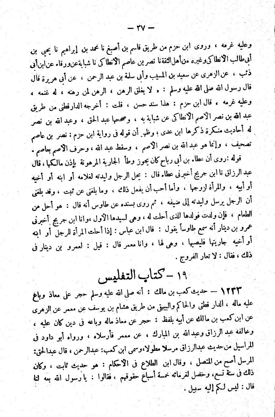 1233 - حديث كعب بن مالك أنه صلى الله عليه و سلم حجر على معاذ وباع عليه ماله الدارقطني والحاكم والبيهقي من طريق هشام بن يوسف عن معمر عن الزهري عن بن كعب بن مالك عن أبيه بلفظ حجر عن معاذ ماله وباعه في دين كان عليه وخالفه عبد الرزاق وعبد الله بن المبارك عن معمر فأرسلاه ورواه أبو داود في المراسيل من حديث عبد الرزاق مرسلا مطولا وسمي بن كعب عبد الرحمن قال عبد الحق المرسل أصح من المتصل وقال بن الطلاع في الأحكام هو حديث ثابت وكان ذلك في سنة تسع وحصل لغرمائه خمسة أسباع حقوقهم فقالوا يا رسول الله بعه لنا قال ليس لكم إليه سبيل