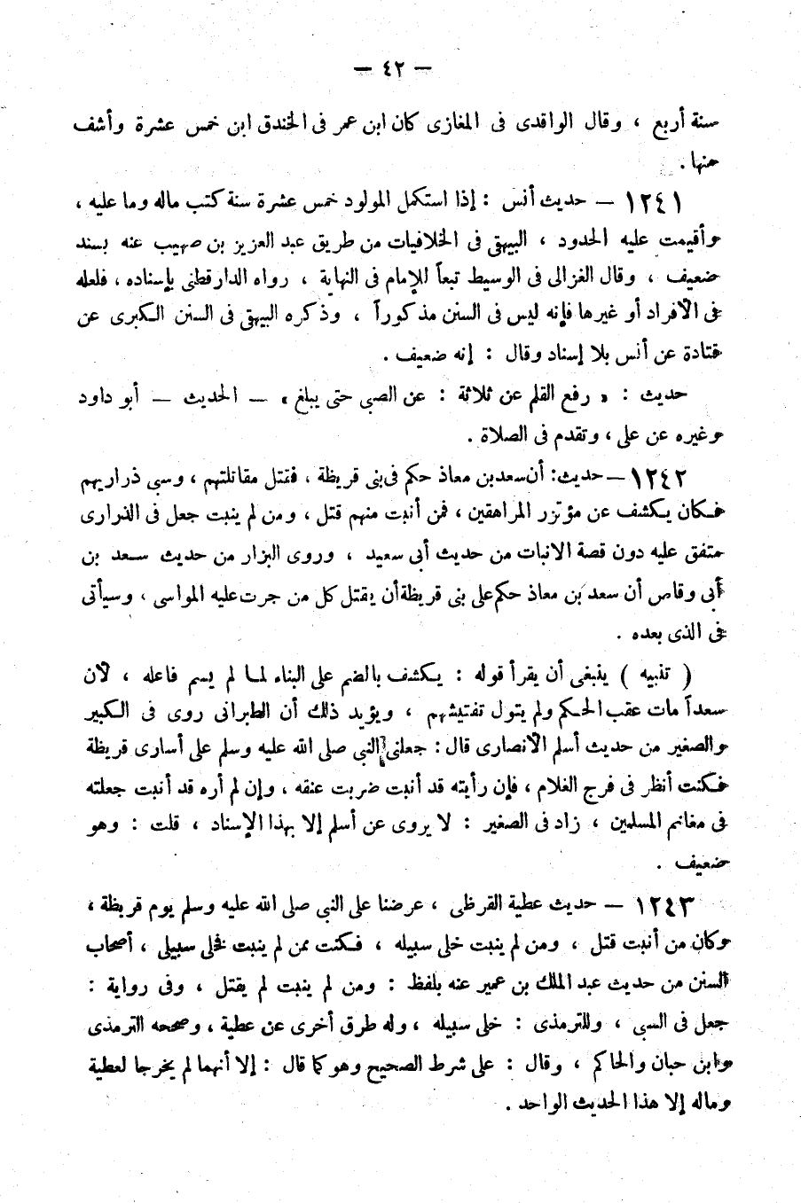 1243 - حديث عطية القرظي عرضنا على النبي صلى الله عليه و سلم يوم قريظة وكان من أنبت قتل ومن لم ينبت خلي سبيله فكنت ممن لم ينبت فخلي سبيلي أصحاب السنن من حديث عبد الملك بن عمير عنه بلفظ ومن لم ينبت لم يقتل وفي رواية جعل في السبي وللترمذي خلي سبيله وله طرق أخرى عن عطية وصححه الترمذي وابن حبان والحاكم وقال على شرط الصحيح وهو كما قال إلا أنهما لم يخرجا لعطية وما له إلا هذا الحديث الواحد