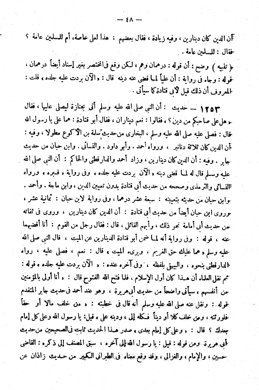 1253 - حديث أن النبي صلى الله عليه و سلم أتي بجنازة ليصلي عليها فقال هل على صاحبكم من دين فقالوا نعم ديناران فقال أبو قتادة هما علي يا رسول الله قال فصلى عليه صلى الله عليه و سلم البخاري من حديث سلمة بن الأكوع مطولا وفيه أن الدين كان ثلاثة دنانير ورواه أحمد وأبو داود والنسائي وابن حبان من حديث جابر وفيه أن الدين كان دينارين وزاد أحمد والدارقطني والحاكم أن النبي صلى الله عليه و سلم قال له لما قضى دينه الآن بردت عليه جلده وفي رواية قبره ورواه النسائي والترمذي وصححه من حديث أبي قتادة بدون تعيين الدين وابن ماجة وأحمد وابن حبان من حديثه بتعيينه سبعة عشر درهما وفي رواية لابن حبان ثمانية عشر وروى بن حبان أيضا من حديث أبي قتادة أن الدين كان دينارين وروى في ثقاته من حديث أبي أمامة نحو ذلك وأبهم القائل قال فقال رجل من القوم أنا أقضيهما عنه قوله وفي رواية أنه لما ضمن أبو قتادة الدينارين عن الميت قال النبي صلى الله عليه و سلم هما عليك حق الغريم وبرئ الميت قال نعم فصلى عليه رواه الدارقطني بنحوه والبيهقي بلفظه وفي آخره عنده الآن بردت عليه جلده قوله ثم نقل العلماء أن هذا كان أول الإسلام فلما فتح الله الفتوح قال أنا أولى بالمؤمنين من أنفسهم سيأتي واضحا من حديث أبي هريرة وهو عند أحمد في حديث جابر المتقدم قوله ونقل عنه صلى الله عليه و سلم أنه قال في خطبته من خلف مالا أو حقا فلورثته ومن خلف كلا أو دينا فكله إلي ودينه علي قيل يا رسول الله وعلى كل إمام بعدك قال وعلى كل إمام بعدي صدر هذا الحديث ثابت في الصحيحين من حديث أبي هريرة ومن قوله قيل يا رسول الله إلى آخره سبق المصنف إلى ذكره القاضي حسين والإمام والغزالي وقد وقع معناه في الطبراني الكبير من حديث زاذان عن