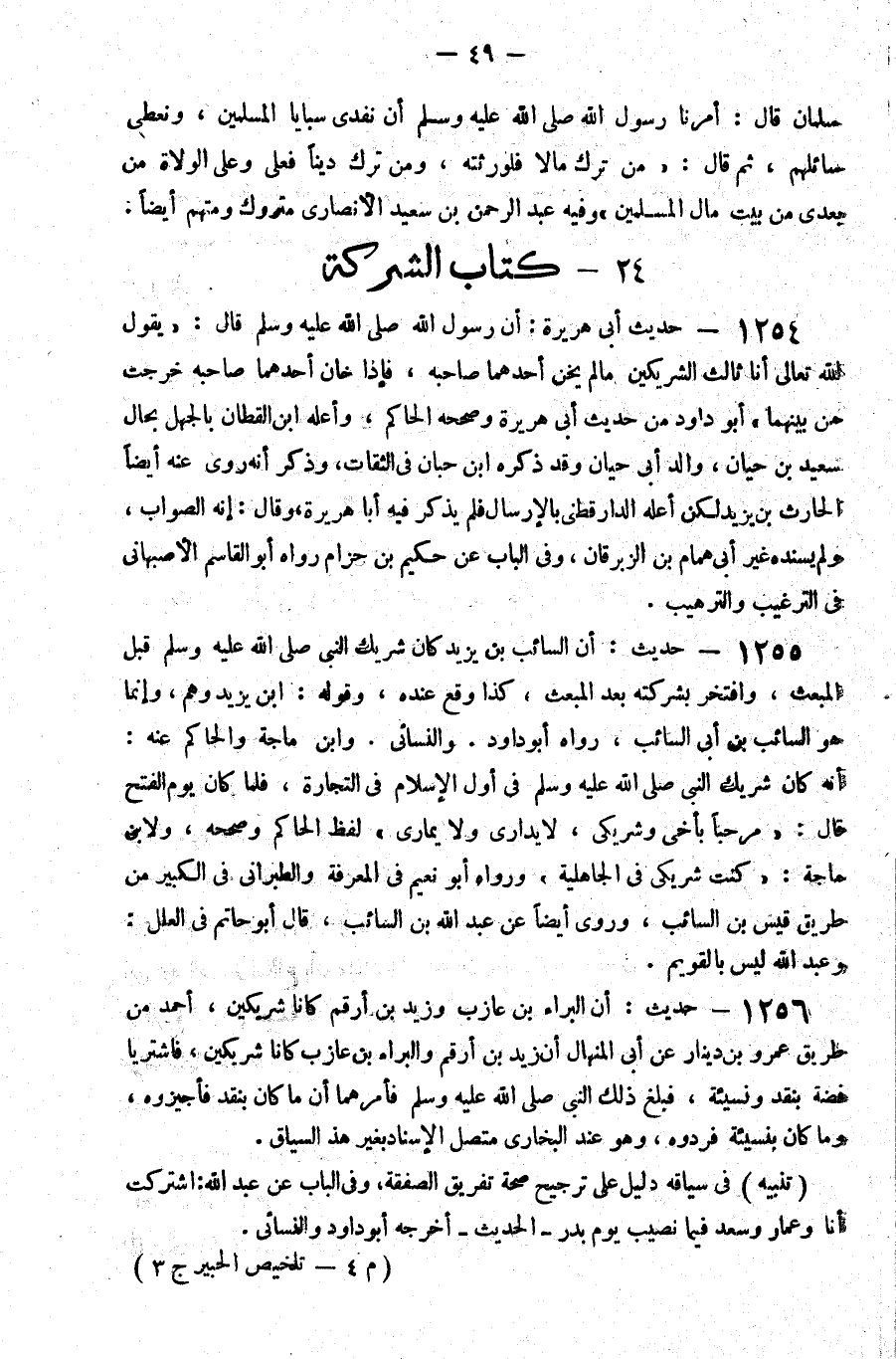 1256 - حديث أن البراء بن عازب وزيد بن أرقم كانا شريكين أحمد من طريق عمرو بن دينار عن أبي المنهال أن زيد بن أرقم والبراء بن عازب كانا شريكين فاشتريا فضة بنقد ونسيئة فبلغ ذلك النبي صلى الله عليه و سلم فأمرهما أن ما كان بنقد فأجيزوه وما كان بنسيئة فردوه وهو عند البخاري متصل الإسناد بغير هذا السياق تنبيه في سياقه دليل على ترجيح صحة تفريق الصفقة وفي الباب عن عبد الله اشتركت أنا وعمار وسعد فيما نصيب يوم بدر الحديث أخرجه أبو داود والنسائي