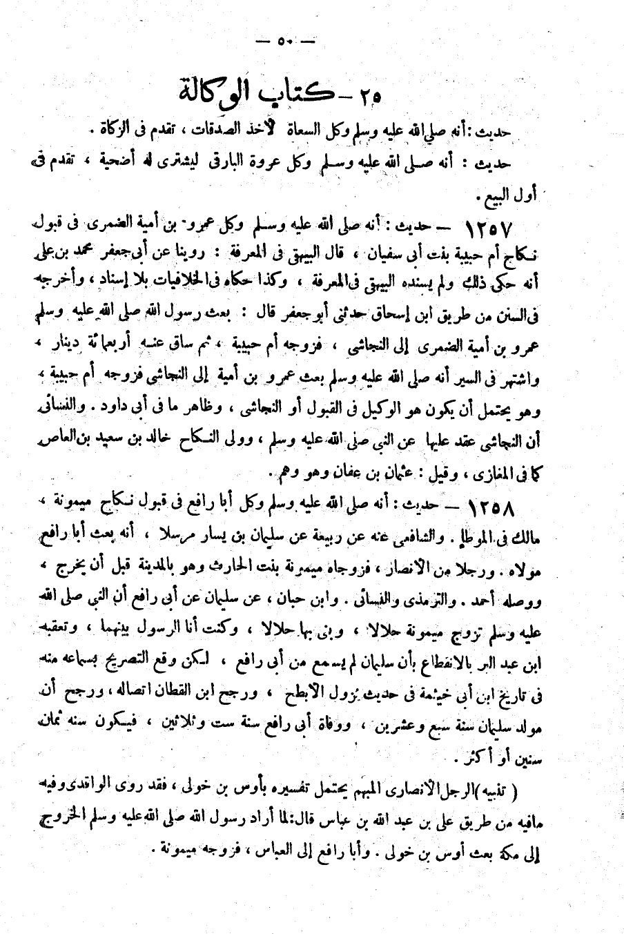 1257 - حديث أنه صلى الله عليه و سلم وكل عمرو بن أمية الضمري في قبول نكاح أم حبيبة بنت أبي سفيان قال البيهقي في المعرفة روينا عن أبي جعفر محمد بن علي أنه حكى ذلك ولم يسنده البيهقي في المعرفة وكذا حكاه في الخلافيات بلا إسناد وأخرجه في السنن من طريق بن إسحاق حدثني أبو جعفر قال بعث رسول الله صلى الله عليه و سلم عمرو بن أمية الضمري إلى النجاشي فزوجه أم حبيبة ثم ساق عنه أربعمائة دينار واشتهر في السير أنه صلى الله عليه و سلم بعث عمرو بن أمية إلى النجاشي فزوجه أم حبيبة وهو يحتمل أن يكون هو الوكيل في القبول أو النجاشي وظاهر ما في أبي داود والنسائي أن النجاشي عقد عليها عن النبي صلى الله عليه و سلم وولى النكاح خالد بن سعيد بن العاص كما في المغازي وقيل عثمان بن عفان وهو وهم