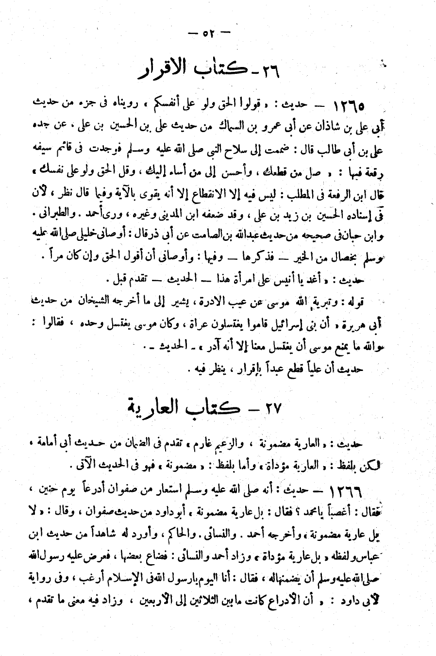 1265 - حديث قولوا الحق ولو على أنفسكم رويناه في جزء من حديث أبي علي بن شاذان عن أبي عمرو بن السماك من حديث علي بن الحسين بن علي عن جده علي بن أبي طالب قال ضممت إلى سلاح النبي صلى الله عليه و سلم فوجدت في قائم سيفه رقعة فيها صل من قطعك وأحسن إلى من أساء إليك وقل الحق ولو على نفسك قال بن الرفعة في المطلب ليس فيه إلا الانقطاع إلا أنه يقوي بالآية وفيما قال نظر لأن في إسناده الحسين بن زيد بن علي وقد ضعفه بن المديني وغيره وروى أحمد والطبراني وابن حبان في صحيحه من حديث عبد الله بن الصامت عن أبي ذر قال أوصاني خليلي صلى الله عليه و سلم بخصال من الخير فذكرها وفيها وأوصاني أن أقول الحق وإن كان مرا
