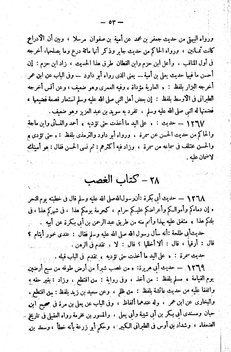 1269 - حديث أبي هريرة من غصب شبرا من أرض طوقه من سبع أرضين يوم القيامة مسلم بلفظ من أخذ وفي رواية من اقتطع وزاد بغير حقه واتفقا عليه من حديث عائشة بلفظ من ظلم وعن سعيد بن زيد بلفظ من اقتطع والبخاري عن بن عمر وله عندهما ألفاظ وفي الباب عن يعلى بن مرة في صحيح بن حبان ومسندي أبي بكر بن أبي شيبة وأبي يعلى والمسور بن مخرمة رواه العقيلي في تاريخ الضعفاء وشداد بن أوس في الطبراني الكبير وحكم أبو زرعة بأنه خطأ وسعد بن