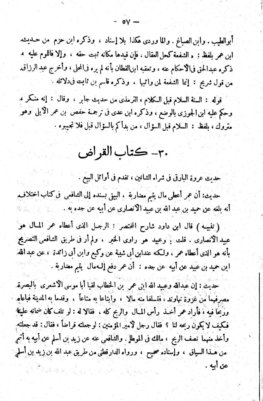 حديث إن عبد الله وعبيد الله ابني عمر بن الخطاب لقيا أبا موسى الأشعري بالبصرة مصرفهما من غزوة نهاوند فتسلفا منه مالا وابتاعا به متاعا وقدما به المدينة فباعاه وربحا فيه فأراد عمر أخذ رأس المال والربح كله فقالا له لو تلف كان ضمانه علينا فكيف لا يكون ربحه لنا فقال رجل لأمير المؤمنين لو جعلته قراضا فقال قد جعلته وأخذ منهما نصف الربح مالك في الموطأ والشافعي عنه عن زيد بن أسلم عن أبيه به أتم من هذا السياق وإسناده صحيح ورواه الدارقطني من طريق عبد الله بن زيد بن أسلم عن أبيه