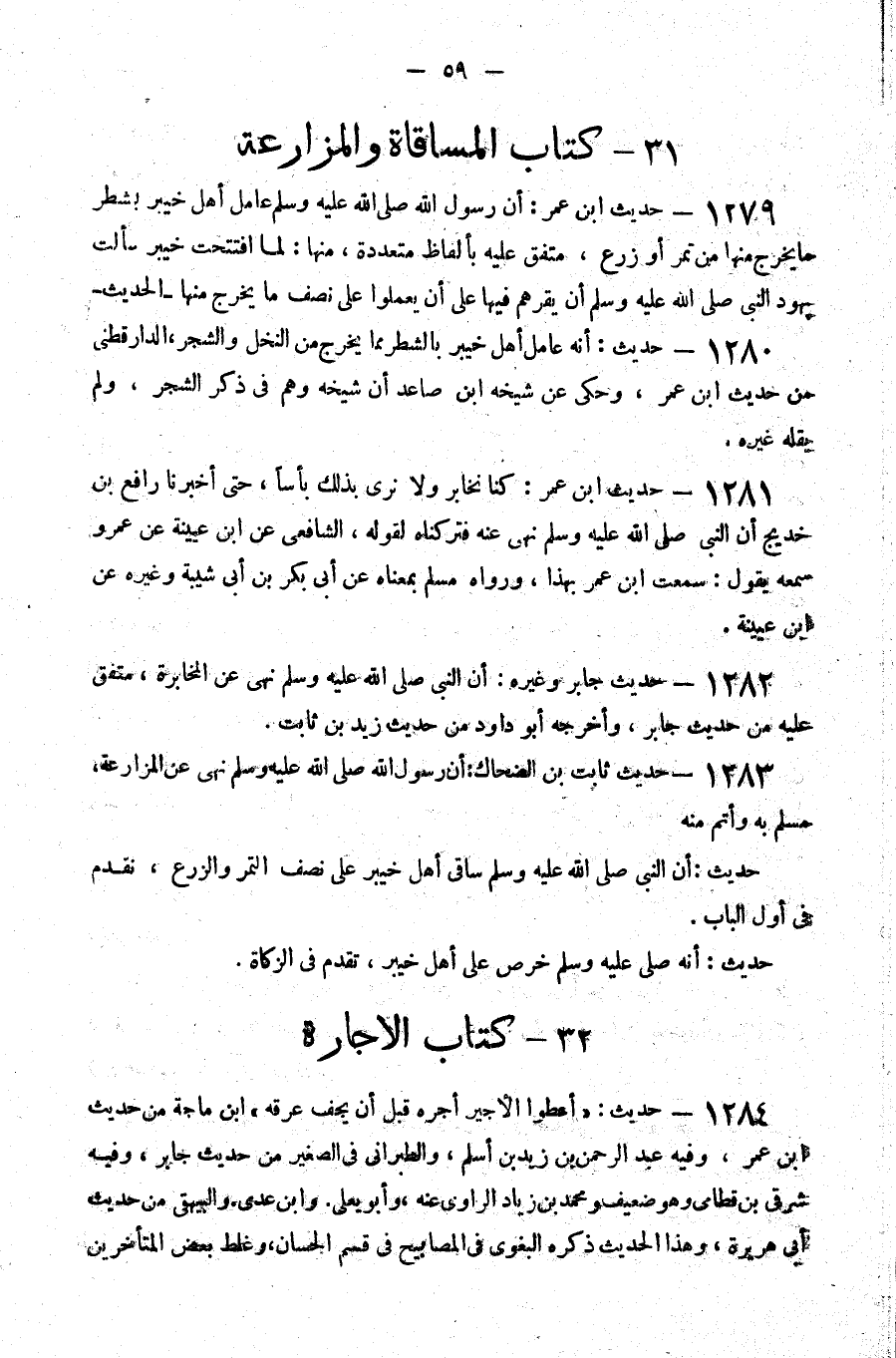 1280 - حديث أنه عامل أهل خيبر بالشطر مما يخرج من النخل والشجر الدارقطني من حديث بن عمر وحكي عن شيخه بن صاعد أن شيخه وهم في ذكر الشجر ولم يقله غيره