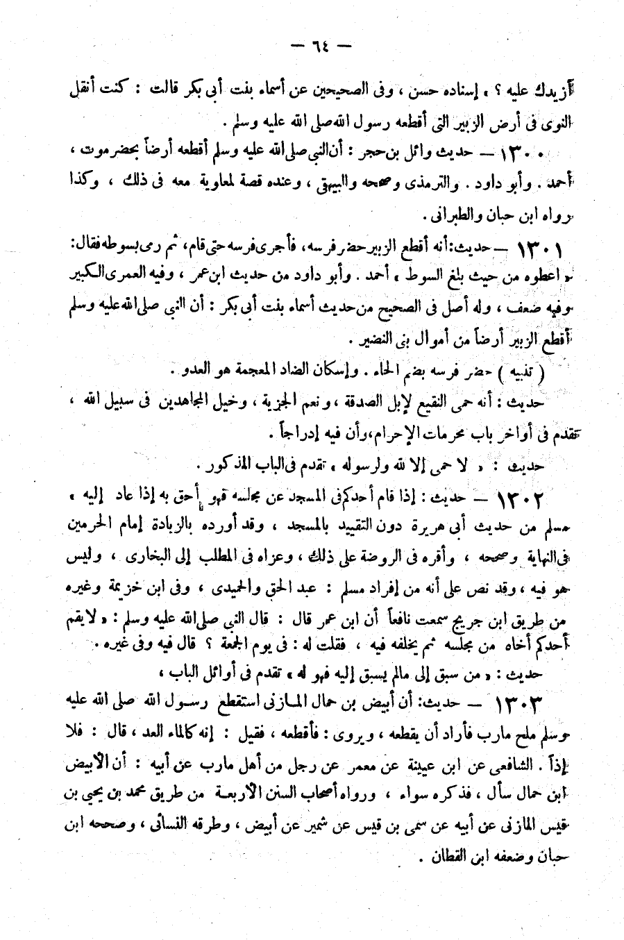 1300 - حديث وائل بن حجر أن النبي صلى الله عليه و سلم أقطعه أرضا بحضرموت أحمد وأبو داود والترمذي وصححه والبيهقي وعنده قصة لمعاوية معه في ذلك وكذا رواه بن حبان والطبراني