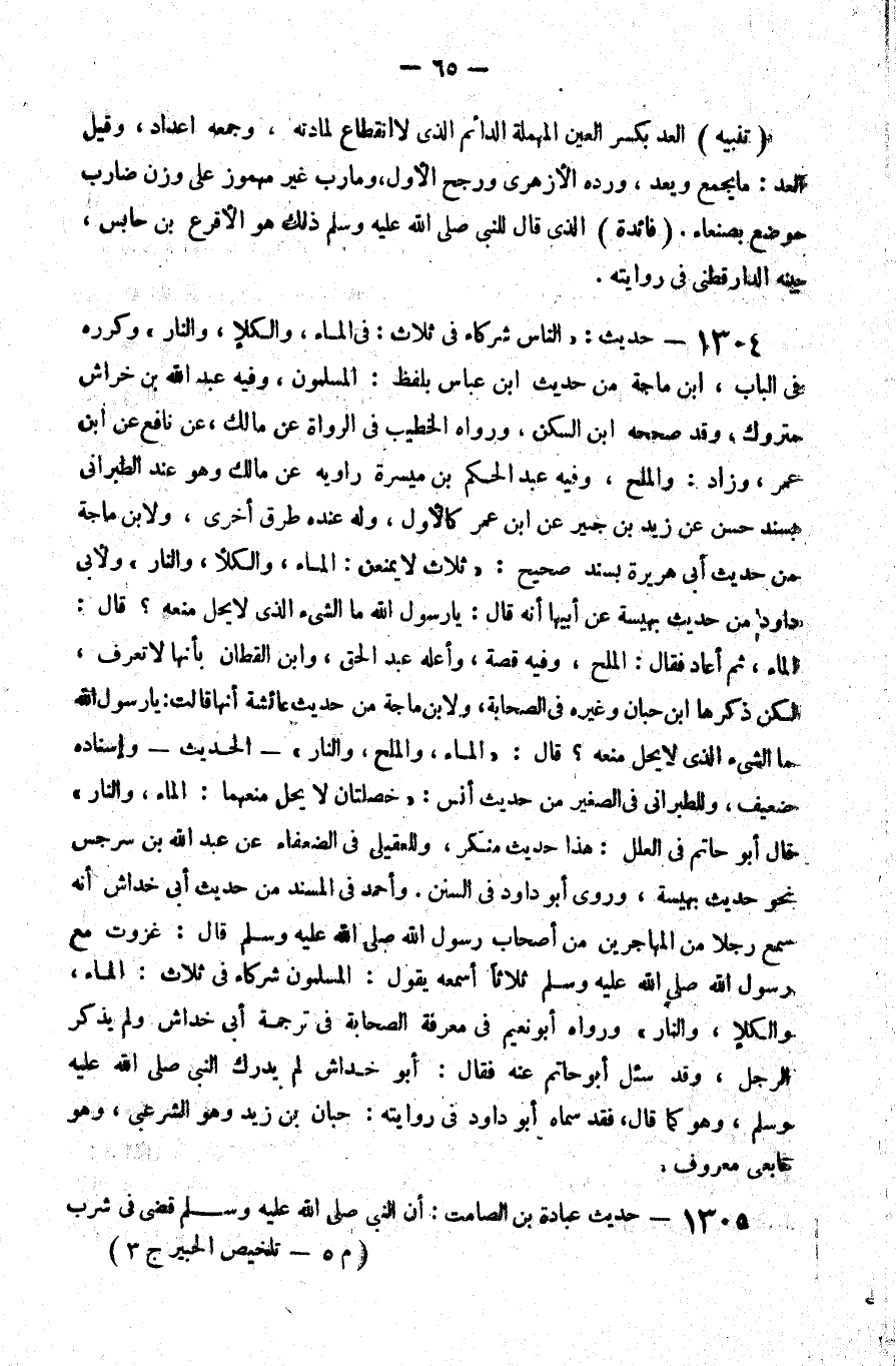 1304 - حديث الناس شركاء في ثلاث في الماء والكلإ والنار وكرره في الباب بن ماجة من حديث بن عباس بلفظ المسلمون وفيه عبد الله بن خراش متروك وقد صححه بن السكن ورواه الخطيب في الرواة عن مالك عن نافع عن بن عمر وزاد والملح وفيه عبد الحكم بن ميسرة راويه عن مالك وهو عند الطبراني بسند حسن عن زيد بن جبير عن بن عمر كالأول وله عنده طرق أخرى ولابن ماجة من حديث أبي هريرة بسند صحيح ثلاث لا يمنعن الماء والكلأ والنار ولأبي داود من حديث بهيسة عن أبيها أنه قال يا رسول الله ما الشيء الذي لا يحل منعه قال الماء ثم أعاد فقال الملح وفيه قصة وأعله عبد الحق وابن القطان بأنها لا تعرف لكن ذكرها بن حبان وغيره في الصحابة ولابن ماجة من حديث عائشة أنها قالت يا رسول الله ما الشيء الذي لا يحل منعه قال الماء والملح والنار الحديث وإسناده ضعيف وللطبراني في الصغير من حديث أنس خصلتان لا يحل منعهما الماء والنار قال أبو حاتم في العلل هذا حديث منكر وللعقيلي في الضعفاء عن عبد الله بن سرجس نحو حديث بهيسة وروى أبو داود في السنن وأحمد في المسند من حديث أبي خداش أنه سمع رجلا من المهاجرين من أصحاب رسول الله صلى الله عليه و سلم قال غزوت مع رسول الله صلى الله عليه و سلم ثلاثا أسمعه يقول المسلمون شركاء في ثلاث الماء والكلإ والنار ورواه أبو نعيم في معرفة الصحابة في ترجمة أبي خداش ولم يذكر الرجل وقد سئل أبو حاتم عنه فقال أبو خداش لم يدرك النبي صلى الله عليه و سلم وهو كما قال فقد سماه أبو داود في روايته حبان بن زيد وهو الشرعبي وهو تابعي معروف