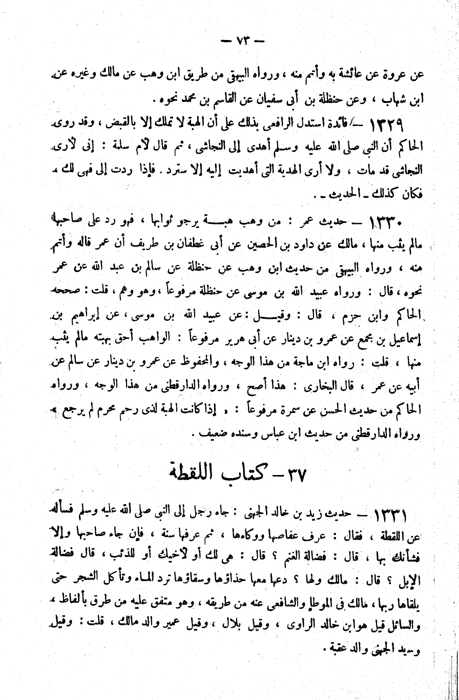 1331 - حديث زيد بن خالد الجهني جاء رجل إلى النبي صلى الله عليه و سلم فسأله عن اللقطة فقال عرف عفاصها ووكاءها ثم عرفها سنة فإن جاء صاحبها وإلا فشأنك بها قال فضالة الغنم قال هي لك أو لأخيك أو للذئب قال فضالة الإبل قال مالك ولها دعها معها حذاؤها وسقاؤها ترد الماء وتأكل الشجر حتى يلقاها ربها مالك في الموطأ والشافعي عنه من طريقه وهو متفق عليه من طرق بألفاظ والسائل قيل هو بن خالد الراوي وقيل بلال وقيل عمير والد مالك قلت وقيل وسيد الجهني والد عقبة