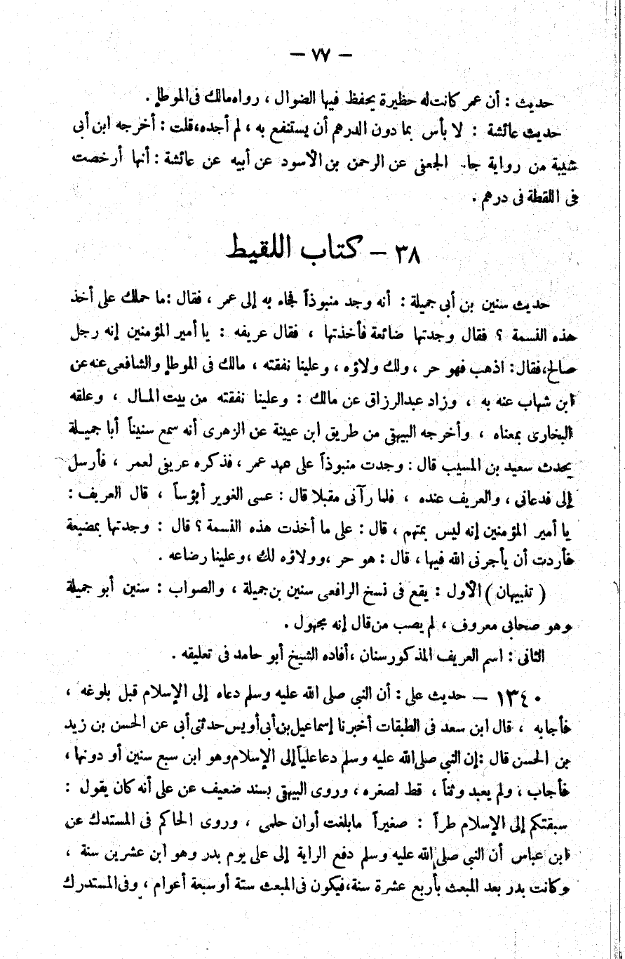حديث سنين بن أبي جميلة أنه وجد منبوذا فجاء به إلى عمر فقال ما حملك على أخذ هذه النسمة فقال وجدتها ضائعة فأخذتها فقال عريفه يا أمير المؤمنين إنه رجل صالح فقال اذهب فهو حر ولك ولاؤه وعلينا نفقته مالك في الموطأ والشافعي عنه عن بن شهاب به وزاد عبد الرزاق عن مالك وعلينا نفقته من بيت المال وعلقه البخاري بمعناه وأخرجه البيهقي من طريق بن عيينة عن الزهري أنه سمع سنينا أبا جميلة يحدث سعيد بن المسيب قال وجدت منبوذا على عهد عمر فذكره عريفي لعمر فأرسل إلي فدعاني والعريف عنده فلما رآني مقبلا قال عسى الغوير أبؤسا قال العريف يا أمير المؤمنين إنه ليس بمتهم قال على ما أخذت هذه النسمة قال وجدتها بمضيعة فأردت أن يأجرني الله فيها قال هو حر وولاؤه لك وعلينا رضاعه تنبيهان الأول يقع في نسخ الرافعي سنين بن جميلة والصواب سنين أبو جميلة وهو صحابي معروف لم يصب من قال إنه مجهول الثاني اسم العريف المذكور سنان أفاده الشيخ أبو حامد في تعليقه