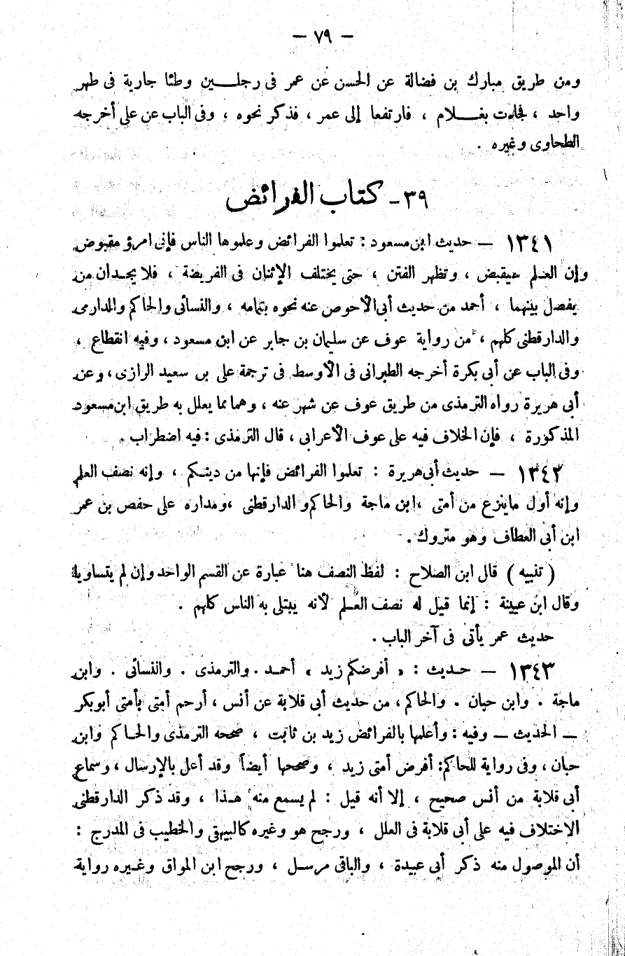 1342 - حديث أبي هريرة تعلموا الفرائض فإنها من دينكم وإنه نصف العلم وإنه أول ما ينزع من أمتي بن ماجة والحاكم والدارقطني ومداره على حفص بن عمر بن أبي العطاف وهو متروك تنبيه قال بن الصلاح لفظ النصف هنا عبارة عن القسم الواحد وإن لم يتساويا وقال بن عيينة إنما قيل له نصف العلم لأنه يبتلى به الناس كلهم