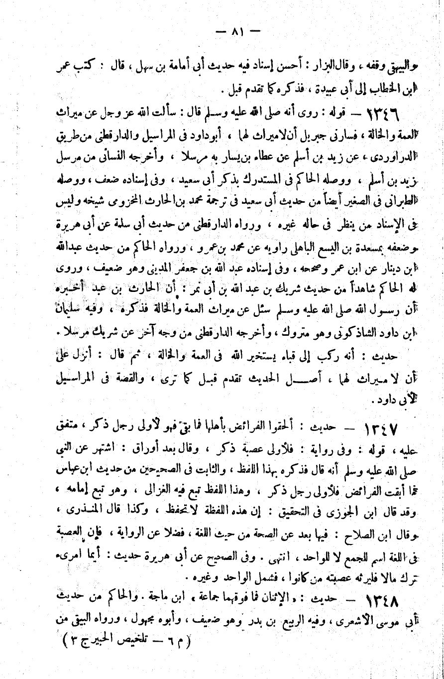 1347 - حديث ألحقوا الفرائض بأهلها فما بقي فهو لأولى رجل ذكر متفق عليه قوله وفي رواية فلأولى عصبة ذكر وقال بعد أوراق اشتهر عن النبي صلى الله عليه و سلم أنه قال فذكره بهذا اللفظ والثابت في الصحيحين من حديث بن عباس فما أبقت الفرائض فلأولى رجل ذكر وهذا اللفظ تبع فيه الغزالي وهو تبع إمامه وقد قال بن الجوزي في التحقيق إن هذه اللفظة لا تحفظ وكذا قال المنذري وقال بن الصلاح فيها بعد عن الصحة من حيث اللغة فضلا عن الرواية فإن العصبة في اللغة اسم للجمع لا للواحد انتهى وفي الصحيح عن أبي هريرة حديث أيما امرئ ترك مالا فليرثه عصبته من كانوا فشمل الواحد وغيره