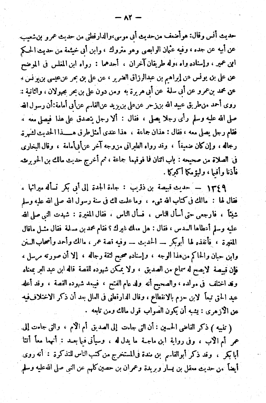 1349 - حديث قبيصة بن ذؤيب جاءت الجدة إلى أبي بكر تسأله ميراثها فقال لها مالك في كتاب الله شيء وما علمت لك في سنة رسول الله صلى الله عليه و سلم شيئا فارجعي حتى أسأل الناس فسأل الناس فقال المغيرة شهدت النبي صلى الله عليه و سلم أعطاها السدس فقال هل معك غيرك فقام محمد بن مسلمة فقال مثل ما قال المغيرة فأنفذه لها أبو بكر الحديث وفيه قصة عمر مالك وأحمد وأصحاب السنن وابن حبان والحاكم من هذا الوجه وإسناده صحيح لثقة رجاله إلا أن صورته مرسل فإن قبيصة لا يصح له سماع من الصديق ولا يمكن شهوده للقصة قاله بن عبد البر بمعناه وقد اختلف في مولده والصحيح أنه ولد عام الفتح فيبعد شهوده القصة وقد أعله عبد الحق تبعا لابن حزم بالانقطاع وقال الدارقطني في العلل بعد أن ذكر الاختلاف فيه عن الأزهري يشبه أن يكون الصواب قول مالك ومن تابعه تنبيه ذكر القاضي الحسين أن التي جاءت إلى الصديق أم الأم والتي جاءت إلى عمر أم الأب وفي رواية بن ماجة ما يدل له وسيأتي فيما بعد أنهما معا أتتا أبا بكر وقد ذكر أبو القاسم بن مندة في المستخرج من كتب الناس للتذكرة أنه روى أيضا من حديث معقل بن يسار وبريدة وعمران بن حصين كلهم عن النبي صلى الله عليه و سلم