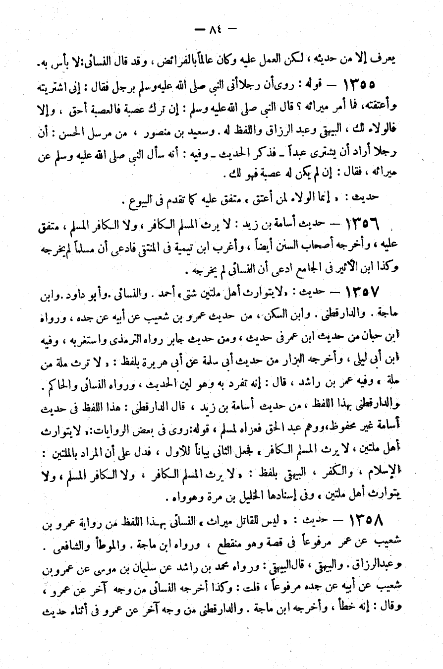 1356 - حديث أسامة بن زيد لا يرث المسلم الكافر ولا الكافر المسلم متفق عليه وأخرجه أصحاب السنن أيضا وأغرب بن تيمية في المنتقى فادعى أن مسلما لم يخرجه وكذا بن الأثير في الجامع ادعى أن النسائي لم يخرجه