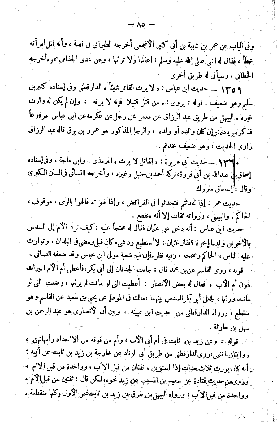 1360 - حديث أبي هريرة القاتل لا يرث الترمذي وابن ماجة وفي إسناده إسحاق بن عبد الله بن أبي فروة تركه أحمد بن حنبل وغيره وأخرجه النسائي في السنن الكبرى وقال إسحاق متروك