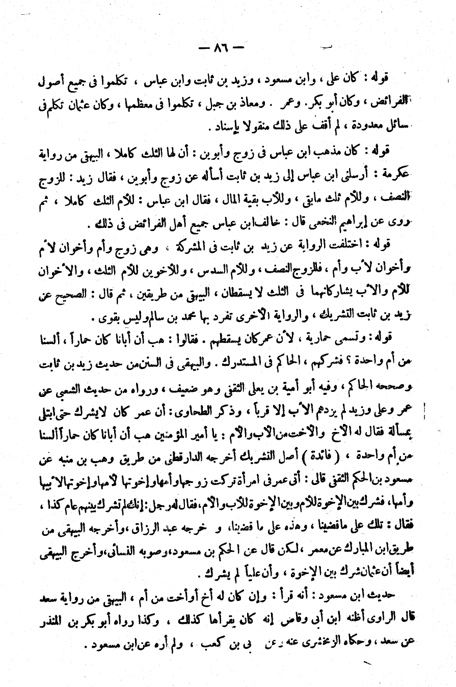 قوله كان علي وابن مسعود وزيد بن ثابت وابن عباس تكلموا في جميع أصول الفرائض وكان أبو بكر وعمر ومعاذ بن جبل تكلموا في معظمها وكان عثمان تكلم في مسائل معدودة لم أقف على ذلك منقولا بإسناد