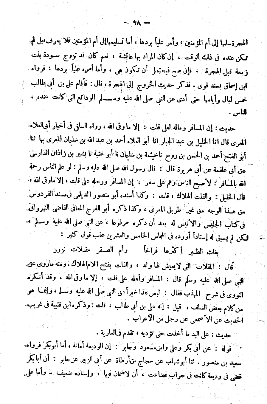 حديث إن المسافر وماله لعلي قلت إلا ما وقى الله رواه السلفي في أخبار أبي العلاء المعري قال انا الخليل بن عبد الجبار انا أبو العلاء أحمد بن عبد الله بن سليمان المعري بها ثنا أبو الفتح أحمد بن الحسن بن روح نا خيثمة بن سليمان نا أبو عتبة نا بشير بن زاذان الدارسي عن أبي علقمة عن أبي هريرة قال قال رسول الله صلى الله عليه و سلم لو علم الناس رحمة الله بالمسافر لأصبح الناس وهم على سفر إن المسافر ورحله على قلت إلا ما وقى الله قال الخليل والقلت الهلاك قلت وكذا أسنده أبو منصور الديلمي في مسند الفردوس من هذا الوجه من غير طريق المعري وكذا ذكره أبو الفرج المعافى القاضي النهرواني في كتاب الجليس والأنيس له بعد أن ذكره مرفوعا عن النبي صلى الله عليه و سلم لكن لم يسبق له إسنادا أورده في المجلس الخامس والعشرين عقب قول كثير ... بغاث الطير أكثرها فراخا ... وأم الصقر مقلات نزور ... قال المقلات التي لا يعيش لها ولد والقلت بفتح اللام الهلاك ومنه ما روي عن النبي صلى الله عليه و سلم قال المسافر وأهله على قلت إلا ما وقى الله وقد أنكره النووي في شرح المهذب فقال ليس هذا خبرا عن النبي صلى الله عليه و سلم وإنما هو من كلام بعض السلف قيل إنه علي بن أبي طالب قلت وذكره بن قتيبة في غريب الحديث عن الأصمعي عن رجل من الأعراب