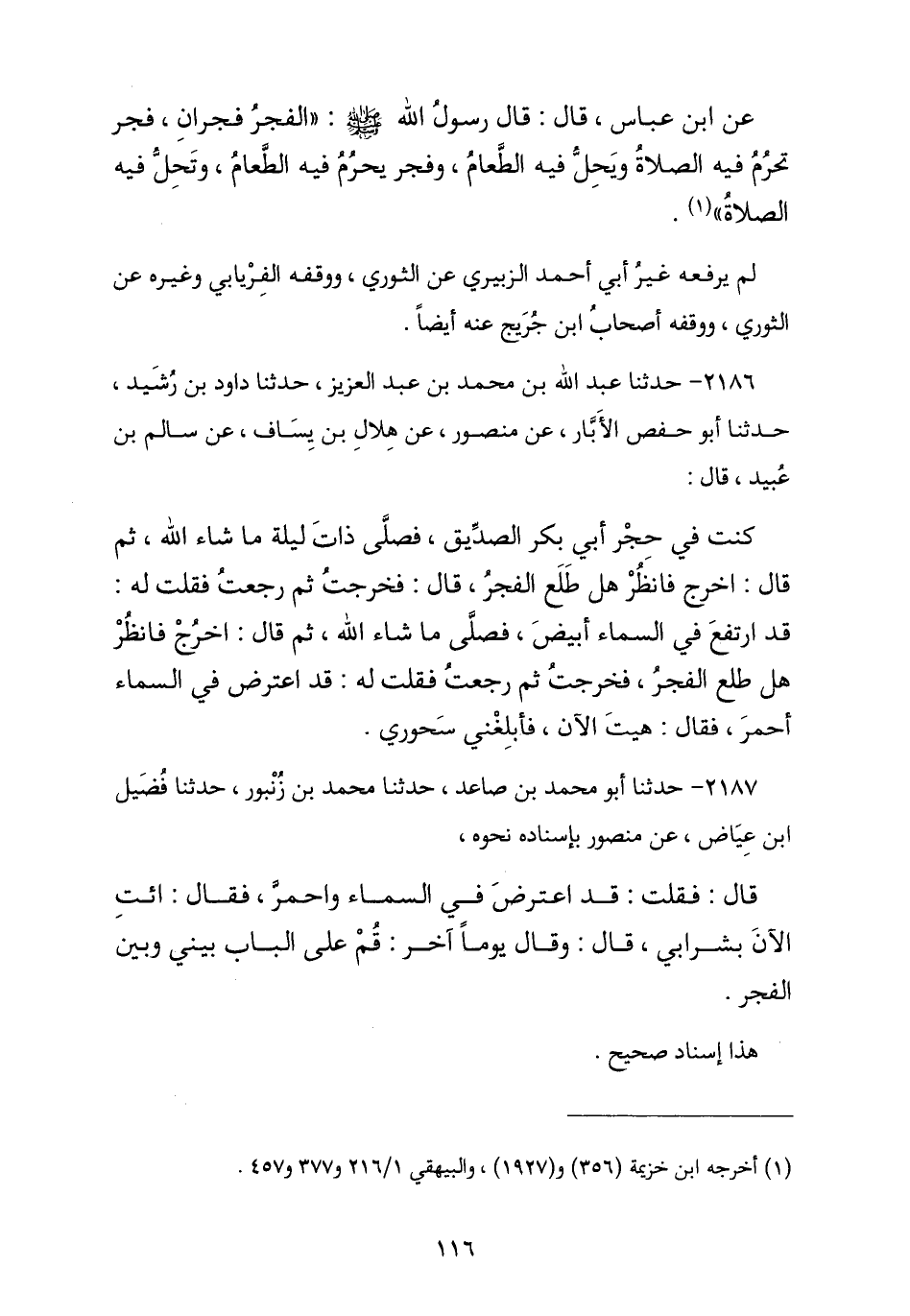 2187 - حَدَّثَنَا أَبُو مُحَمَّدِ بْنُ صَاعِدٍ , ثنا مُحَمَّدُ بْنُ زُنْبُورٍ , ثنا فُضَيْلُ بْنُ عِيَاضٍ , عَنْ مَنْصُورٍ , بِإِسْنَادِهِ نَحْوَهُ , وَقَالَ: فَقُلْتُ: قَدِ اعْتَرَضَ فِي السَّمَاءِ وَاحْمَرَّ , فَقَالَ: «ائْتِ الْآنَ بِشَرَابِي» , قَالَ: وَقَالَ يَوْمًا , آخَرَ: «قُمْ عَلَى الْبَابِ بَيْنِي وَبَيْنَ الْفَجْرِ». وَهَذَا إِسْنَادٌ صَحِيحٌ