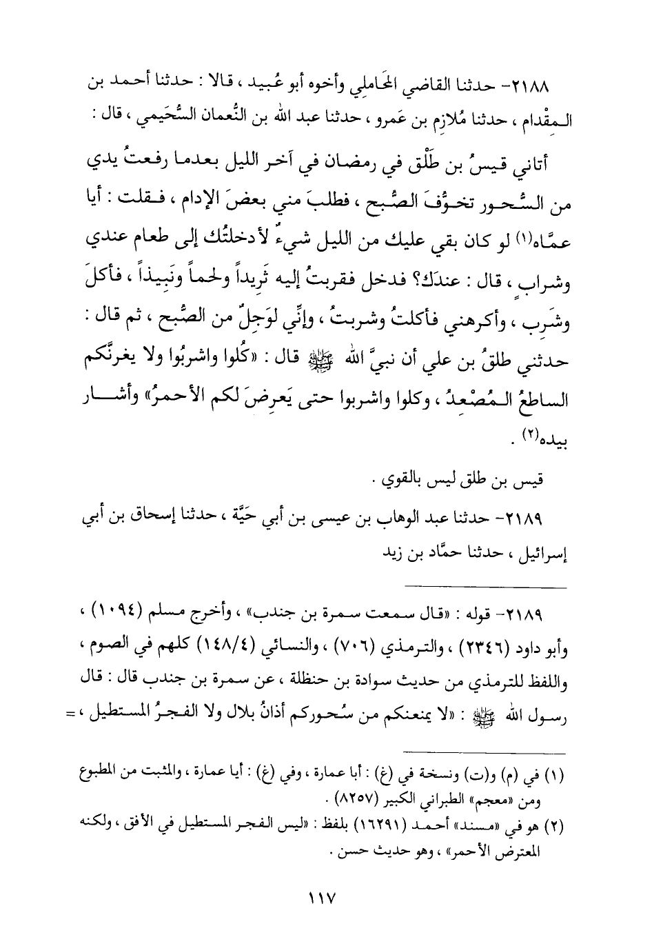 2188 - حَدَّثَنَا الْقَاضِي الْمَحَامِلِيُّ , وَأَخُوهُ أَبُو عُبَيْدٍ , قَالَا: نا أَحْمَدُ بْنُ الْمِقْدَامِ , ثنا مُلَازِمُ بْنُ عَمْرٍو , ثنا عَبْدُ اللَّهِ بْنُ النُّعْمَانِ السَّخِيمِيُّ , قَالَ: أَتَانِي قَيْسُ بْنُ طَلْقٍ فِي رَمَضَانَ فِي آخِرِ اللَّيْلِ بَعْدَمَا رَفَعْتُ يَدِي مِنَ السَّحُورِ لِخَوْفِ الصُّبْحِ فَطَلَبَ مِنِّي بَعْضَ الْإِدَامِ , فَقُلْتُ: أَيَا عَمَّاهُ لَوْ كَانَ بَقِيَ عَلَيْكَ مِنَ اللَّيْلِ شَيْءٌ لَأُدْخِلَنَّكَ إِلَى طَعَامٍ عِنْدِي وَشَرَابٍ , قَالَ: عِنْدَكَ فَدَخَلَ فَقَرَّبَتْ إِلَيْهِ ثَرِيدًا وَلَحْمًا وَنَبِيذًا فَأَكَلَ وَشَرِبَ وَأَكْرَهَنِي فَأَكَلْتُ وَشَرِبْتُ وَإِنِّي لَوَجِلٌ مِنَ الصُّبْحِ , ثُمَّ قَالَ: حَدَّثَنِي طَلْقُ بْنُ عَلِيٍّ , أَنَّ نَبِيَّ اللَّهِ صَلَّى اللهُ عَلَيْهِ وَسَلَّمَ قَالَ: § «كُلُوا وَاشْرَبُوا وَلَا يَغُرَّنَّكُمُ السَّاطِعُ الْمُصْعِدُ وَكُلُوا وَاشْرَبُوا حَتَّى يَعْرِضَ لَكُمُ الْأَحْمَرُ» , وَأَشَارَ بِيَدِهِ قَيْسُ بْنُ طَلْقٍ لَيْسَ بِالْقَوِيِّ
