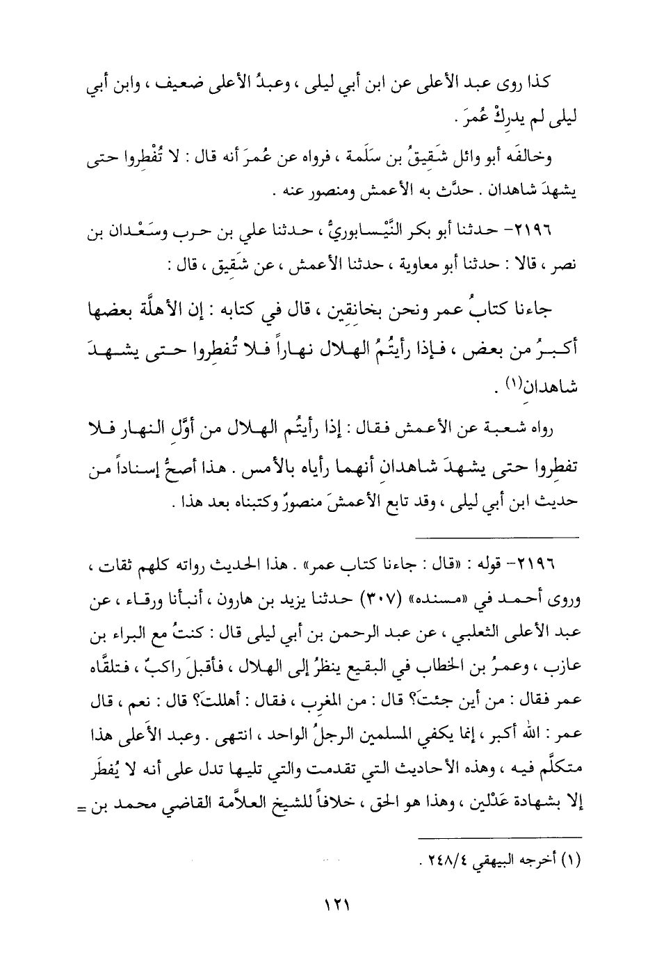 2196 - حَدَّثَنَا أَبُو بَكْرٍ النَّيْسَابُورِيُّ , ثنا عَلِيُّ بْنُ حَرْبٍ , وَسَعْدَانُ بْنُ نَصْرٍ , قَالَا: نا أَبُو مُعَاوِيَةَ , ثنا الْأَعْمَشُ , عَنْ شَقِيقٍ , قَالَ: جَاءَنَا كِتَابُ عُمَرَ وَنَحْنُ بِخَانِقِينَ , قَالَ فِي كِتَابِهِ: «إِنَّ الْأَهِلَّةَ بَعْضُهَا أَكْبَرُ مِنْ بَعْضٍ §فَإِذَا رَأَيْتُمُ الْهِلَالَ نَهَارًا فَلَا تُفْطِرُوا حَتَّى يَشْهَدَ شَاهِدَانِ». رَوَاهُ شُعْبَةُ , عَنِ الْأَعْمَشِ , فَقَالَ: «إِذَا رَأَيْتُمُ الْهِلَالَ مِنْ أَوَّلِ النَّهَارِ فَلَا تُفْطِرُوا حَتَّى يَشْهَدَ شَاهِدَانِ أَنَّهُمَا رَأَيَاهُ بِالْأَمْسِ». هَذَا أَصَحُّ مِنْ حَدِيثِ ابْنِ أَبِي لَيْلَى. وَقَدْ تَابَعَ الْأَعْمَشُ , عَنْ مَنْصُورٍ