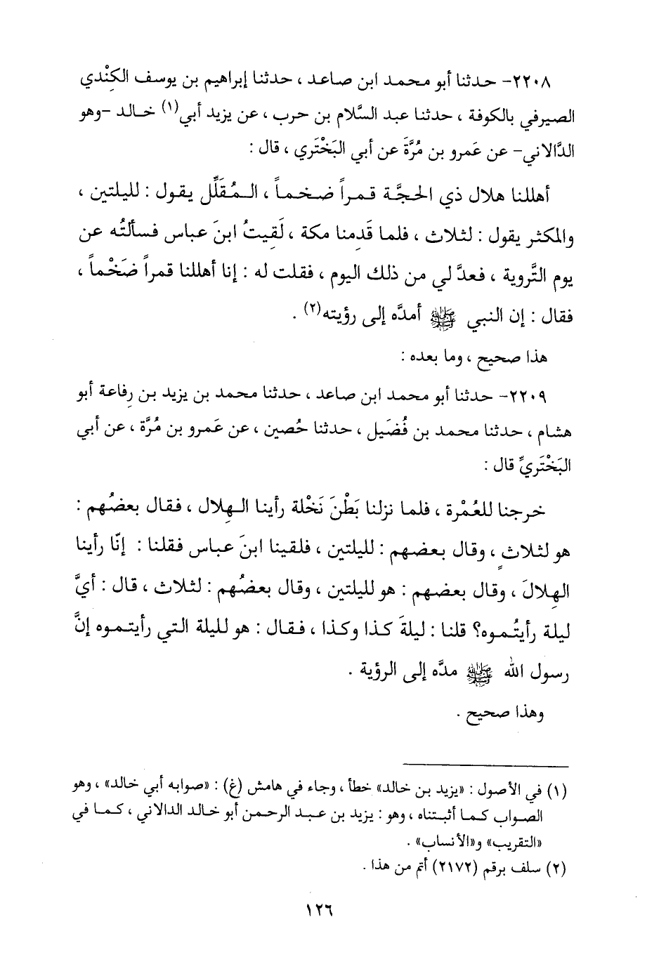 2209 - حَدَّثَنَا أَبُو مُحَمَّدِ بْنُ صَاعِدٍ , حَدَّثَنَا مُحَمَّدُ بْنُ يَزِيدَ بْنِ رِفَاعَةَ أَبُو هِشَامٍ , ثنا مُحَمَّدُ بْنُ فُضَيْلٍ , ثنا حُصَيْنٌ , عَنْ عَمْرِو بْنِ مُرَّةَ , عَنْ أَبِي الْبَخْتَرِيِّ , قَالَ: §خَرَجْنَا لِلْعُمْرَةِ فَلَمَّا نَزَلْنَا بَطْنَ نَخْلَةَ رَأَيْنَا الْهِلَالَ , فَقَالَ بَعْضُهُمْ: هُوَ لِثَلَاثٍ وَقَالَ بَعْضُهُمْ: لِلَيْلَتَيْنِ فَلَقِينَا ابْنَ عَبَّاسٍ , فَقُلْنَا لَهُ: إِنَّا رَأَيْنَا الْهِلَالَ وَقَالَ بَعْضُهُمْ: هُوَ لِلَيْلَتَيْنِ وَقَالَ بَعْضُهُمْ: لِثَلَاثٍ , قَالَ: «أَيَّ لَيْلَةٍ رَأَيْتُمُوهُ؟» , قُلْنَا: لَيْلَةَ كَذَا وَكَذَا , فَقَالَ: «هُوَ لِلَّيْلَةِ الَّتِي رَأَيْتُمُوهُ إِنَّ رَسُولَ اللَّهِ صَلَّى اللهُ عَلَيْهِ وَسَلَّمَ مَدَّهُ إِلَى الرُّؤْيَةِ». وَهَذَا صَحِيحٌ