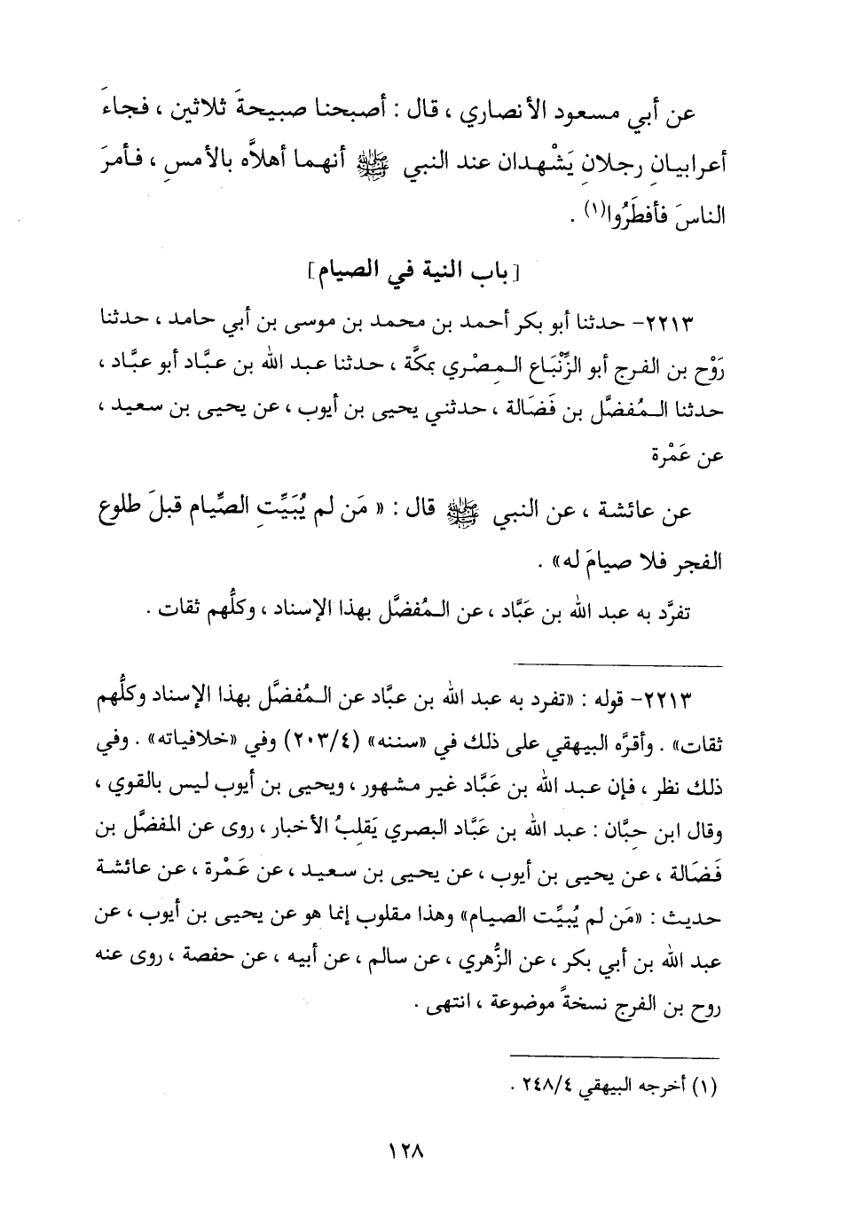 2213 - حَدَّثَنَا أَبُو بَكْرٍ أَحْمَدُ بْنُ مُحَمَّدِ بْنِ مُوسَى بْنِ أَبِي حَامِدٍ , ثنا رَوْحُ بْنُ الْفَرَجِ أَبُو الزِّنْبَاعِ الْمِصْرِيُّ بِمَكَّةَ , ثنا عَبْدُ اللَّهِ بْنُ عَبَّادٍ أَبُو عَبَّادٍ , ثنا الْمُفَضَّلُ بْنُ فَضَالَةَ , حَدَّثَنِي يَحْيَى بْنُ أَيُّوبَ , عَنْ يَحْيَى بْنِ سَعِيدٍ , عَنْ عَمْرَةَ , عَنْ عَائِشَةَ , عَنِ النَّبِيِّ صَلَّى اللهُ عَلَيْهِ وَسَلَّمَ قَالَ: § «مَنْ لَمْ يُبَيِّتِ الصِّيَامَ قَبْلَ طُلُوعِ الْفَجْرِ فَلَا صِيَامَ لَهُ». تَفَرَّدَ بِهِ عَبْدُ اللَّهِ بْنُ عَبَّادٍ , عَنِ الْمُفَضَّلِ بِهَذَا الْإِسْنَادِ , وَكُلُّهُمْ ثِقَاتٌ